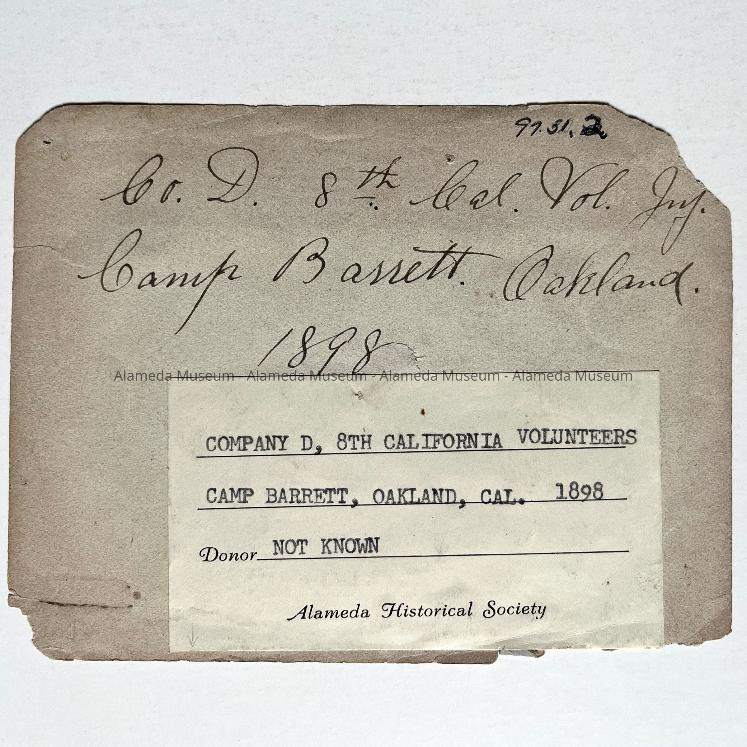 Photo of men of Company D with visitors, at Camp Barrett, Oakland, 1898Entry/Object ID