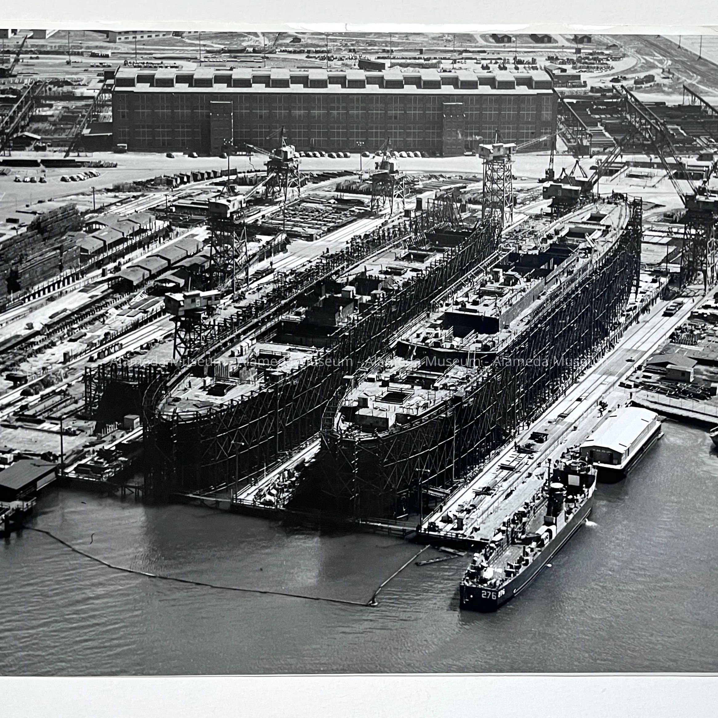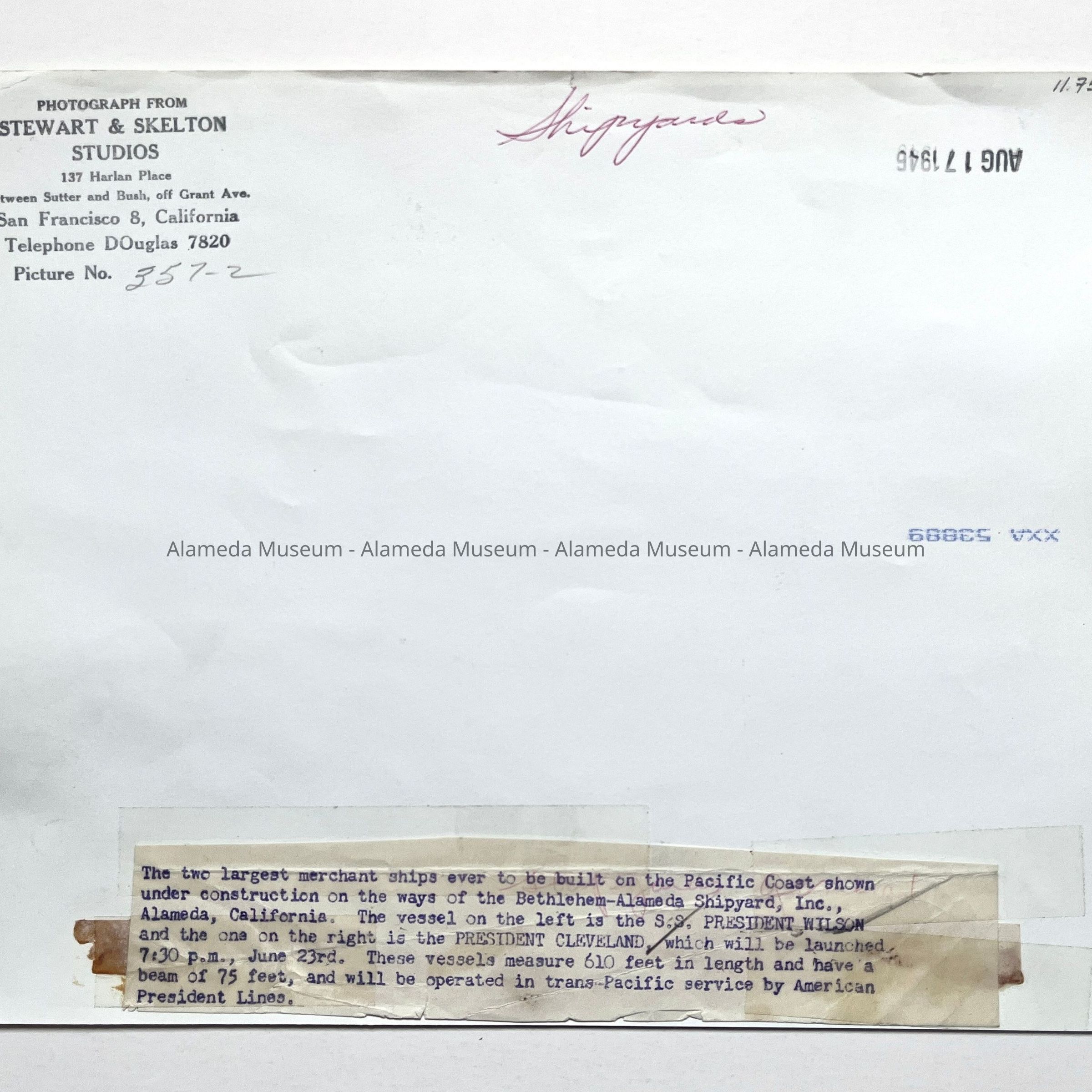 HISTORY OF OBJECT: A PHOTO OF TWO MERCHANT SHIPS BEING CONSTRUCTED AT THE BETHLEHEM SHIPYARD, ALAMEDA. THE VESSEL ON THE LEFT IS THE "S.S. PRESIDENT WILSON;" ON THE RIGHT IS THE "S.S. PRESIDENT CLEVELAND." BOTH SHIPS WERE TO BE LAUNCHED ON JUNE 23, 1946.
