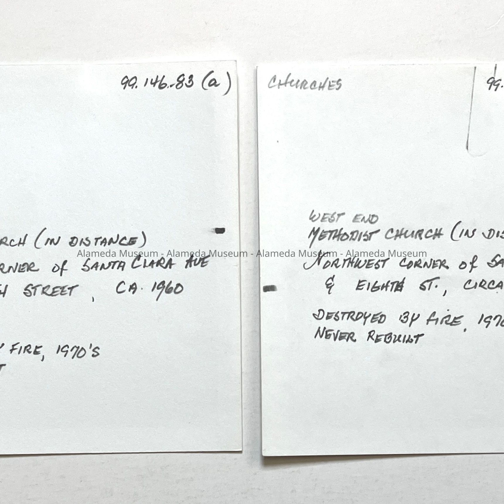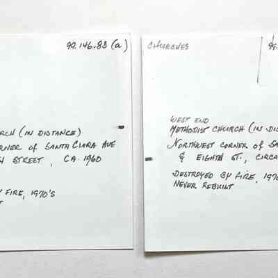 History of Object: Distant view of the Methodist Church that was located at the Northwest corner of Santa Clara Avenue and Eighth Street. It was destroyed by fire in the 1970's and never rebuilt. Its congregation merged with Twin Towers Methodist Church at the corner of Central Avenue and Oak Street.