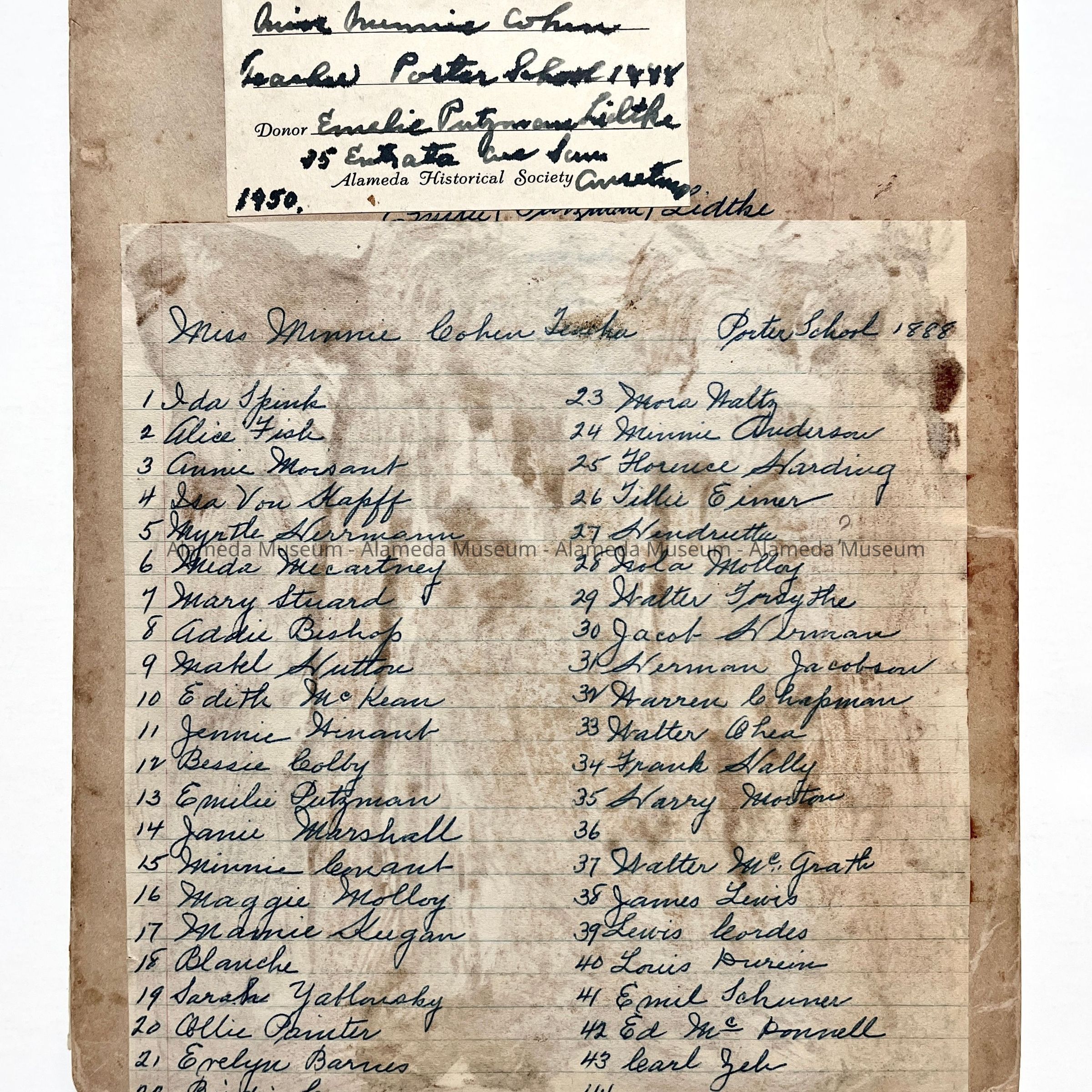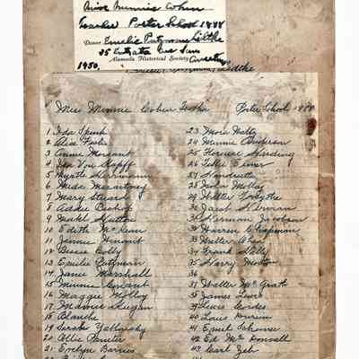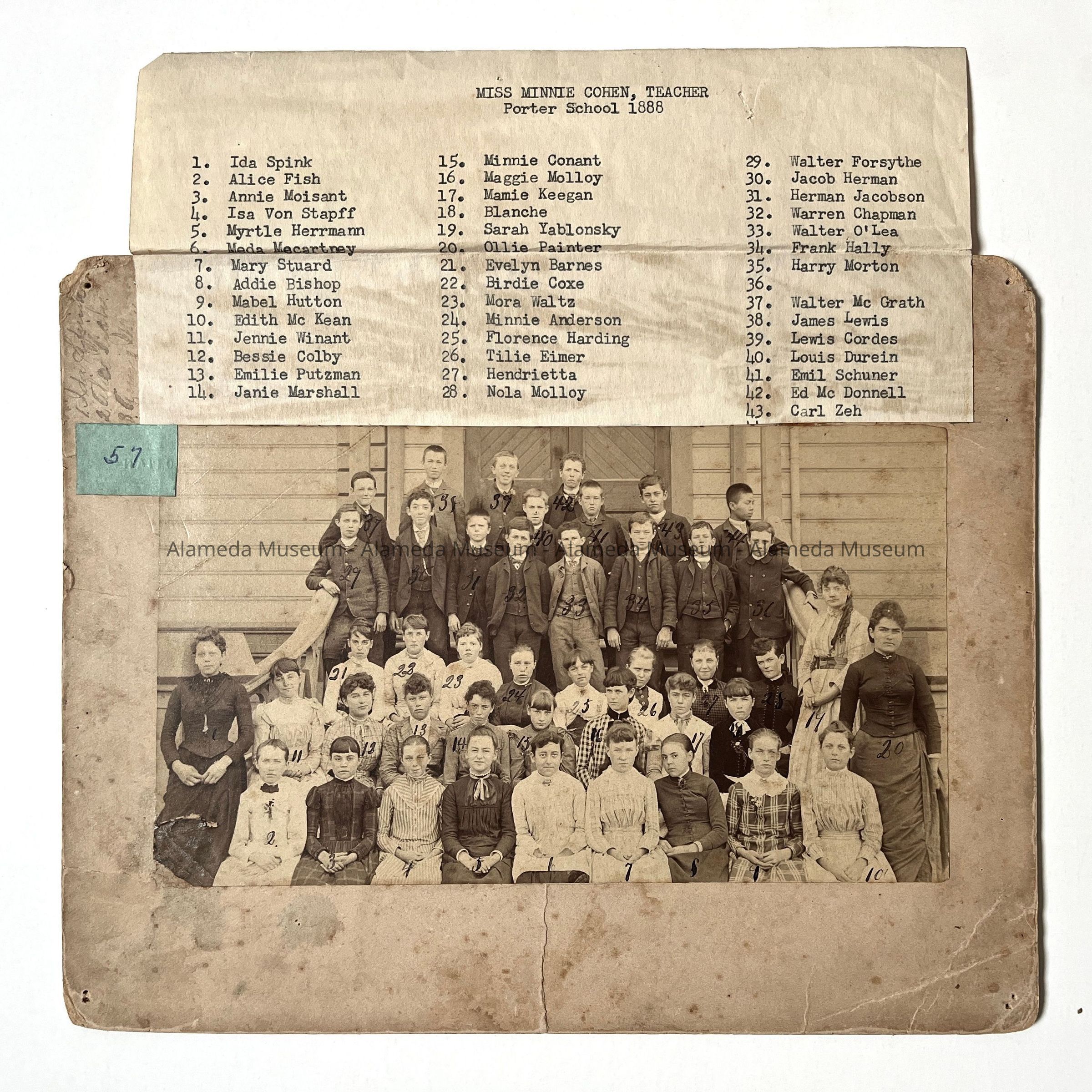 History of Object: Porter School class, 1888. Grade unknown, but Miss Minnie Cohen is identified as the teacher. The students are identified on lists glued to the mounting as well as handwritten upon the verso.