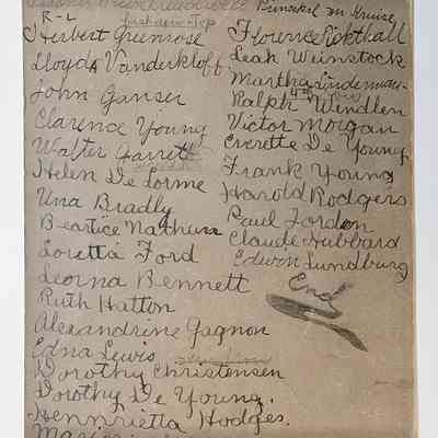 Photo of the fifth grade class, Wilson School, Miss. Treadwell, teacher, 1908. The donor, Martha Linderman Bates, was a member of the class.