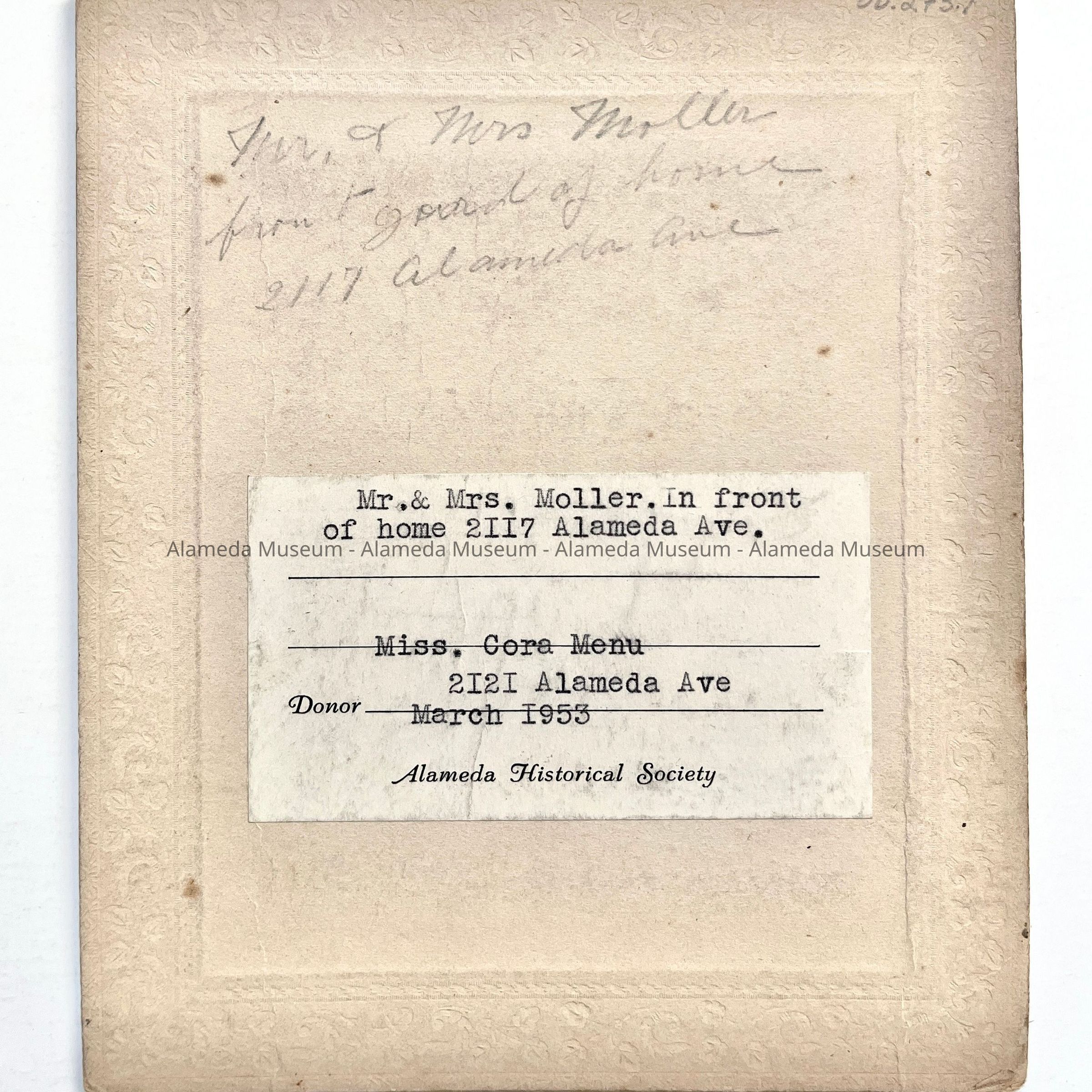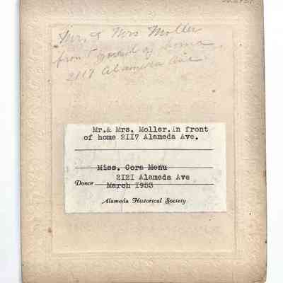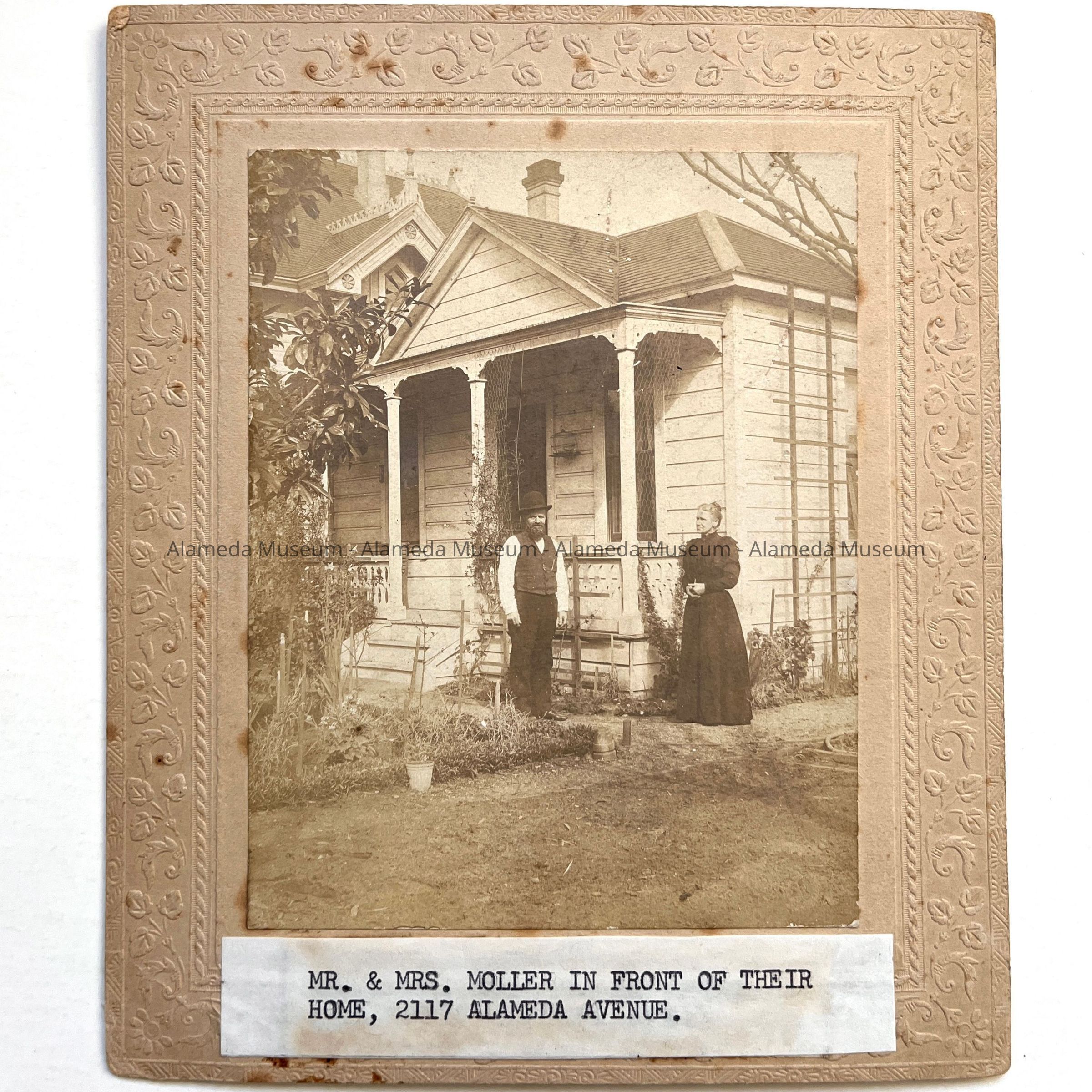 History: Photograph depicting Mr. and Mrs. Moller standing in front of a one-story Victorian cottage at 2117 Alameda Avenue. The photograph was given to the Alameda Historical Society in 1953 and never catalogued.