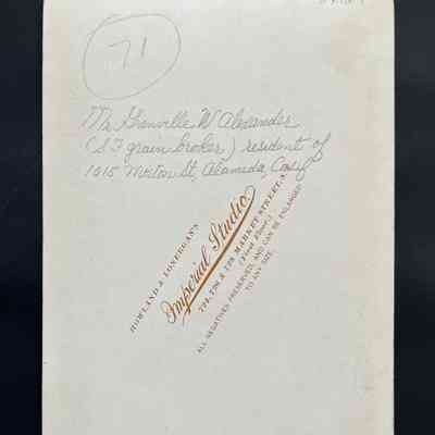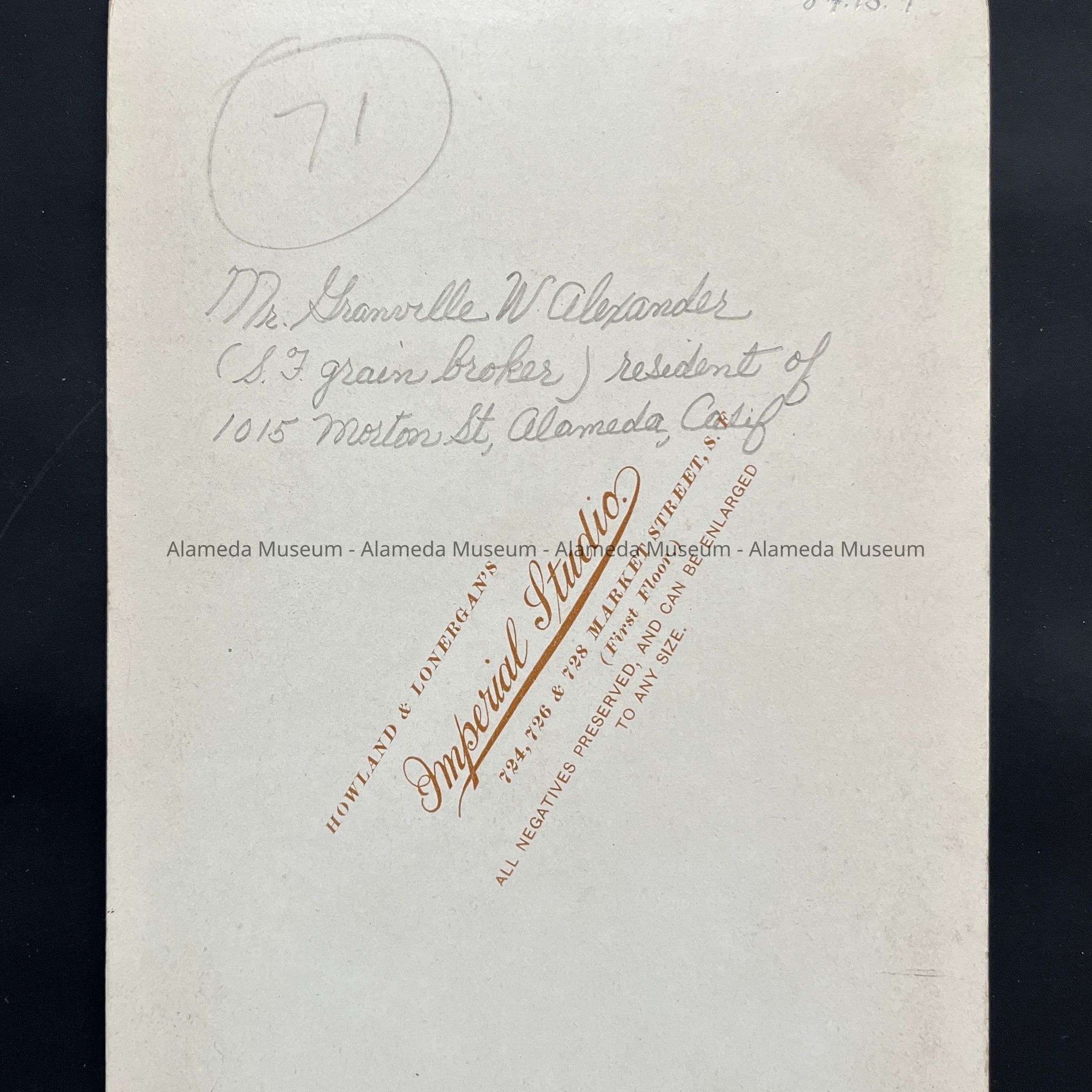 History of Object: Studio photo of Mr. Granville W. Alexander (s. F. grain broker), resident of 1015 Morton Street, Alameda, from approximately 1894 to 1906, afterward moving to San Francisco.