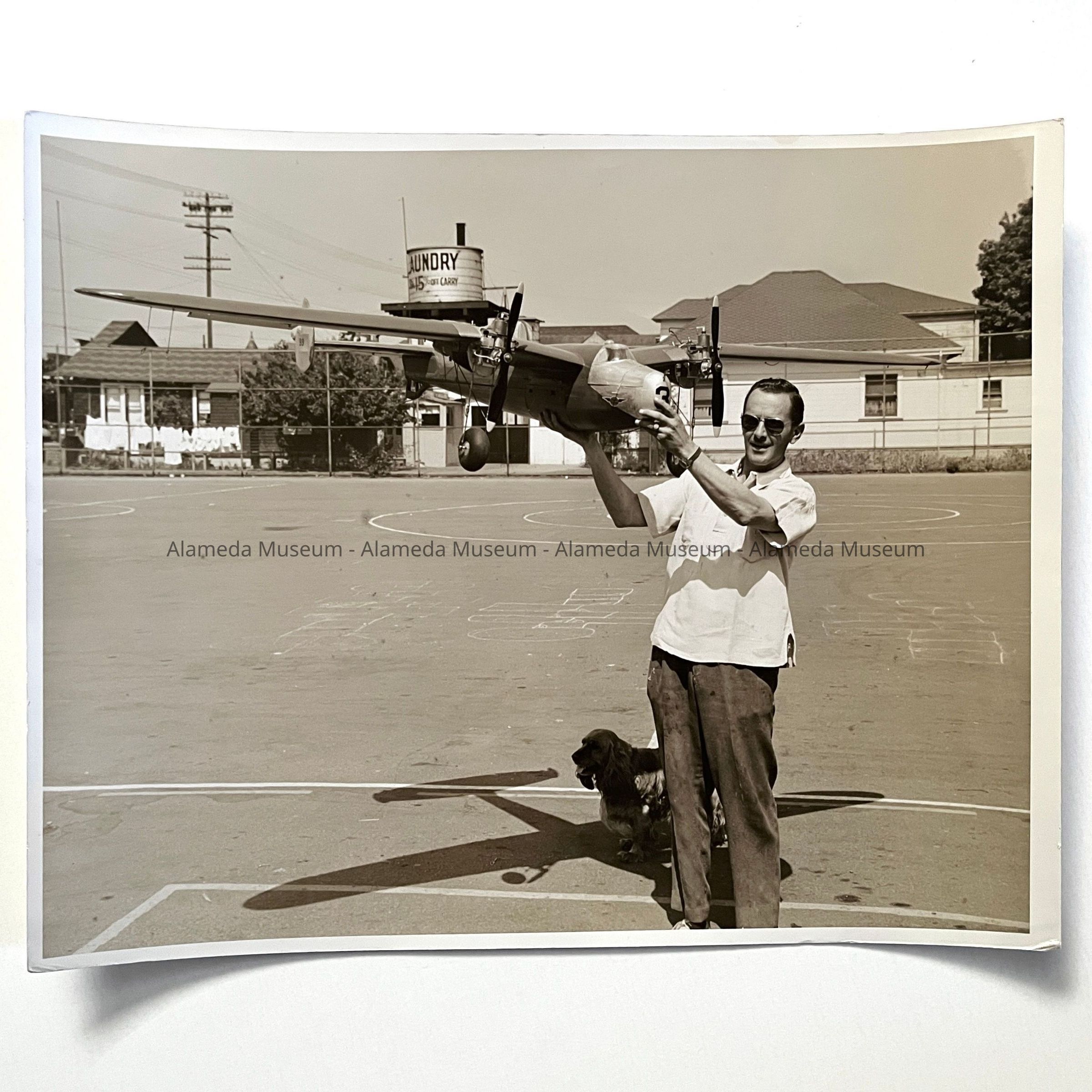 PHOTOGRAPH OF A MR KIRKLAND, HOLDING A TWIN-PROP MODEL AIRPLANE ON THE PLAYGROUND OF PORTER SCHOOL. MR KIRKLAND, AS WELL AS THE DONOR'S BROTHER PAUL, WERE MEMBERS OF A MODEL AIRPLANE CLUB KNOWN AS THE "ALAMEDA MODEL ENGINEERS CLUB."