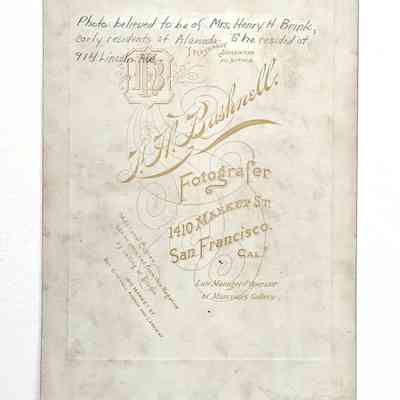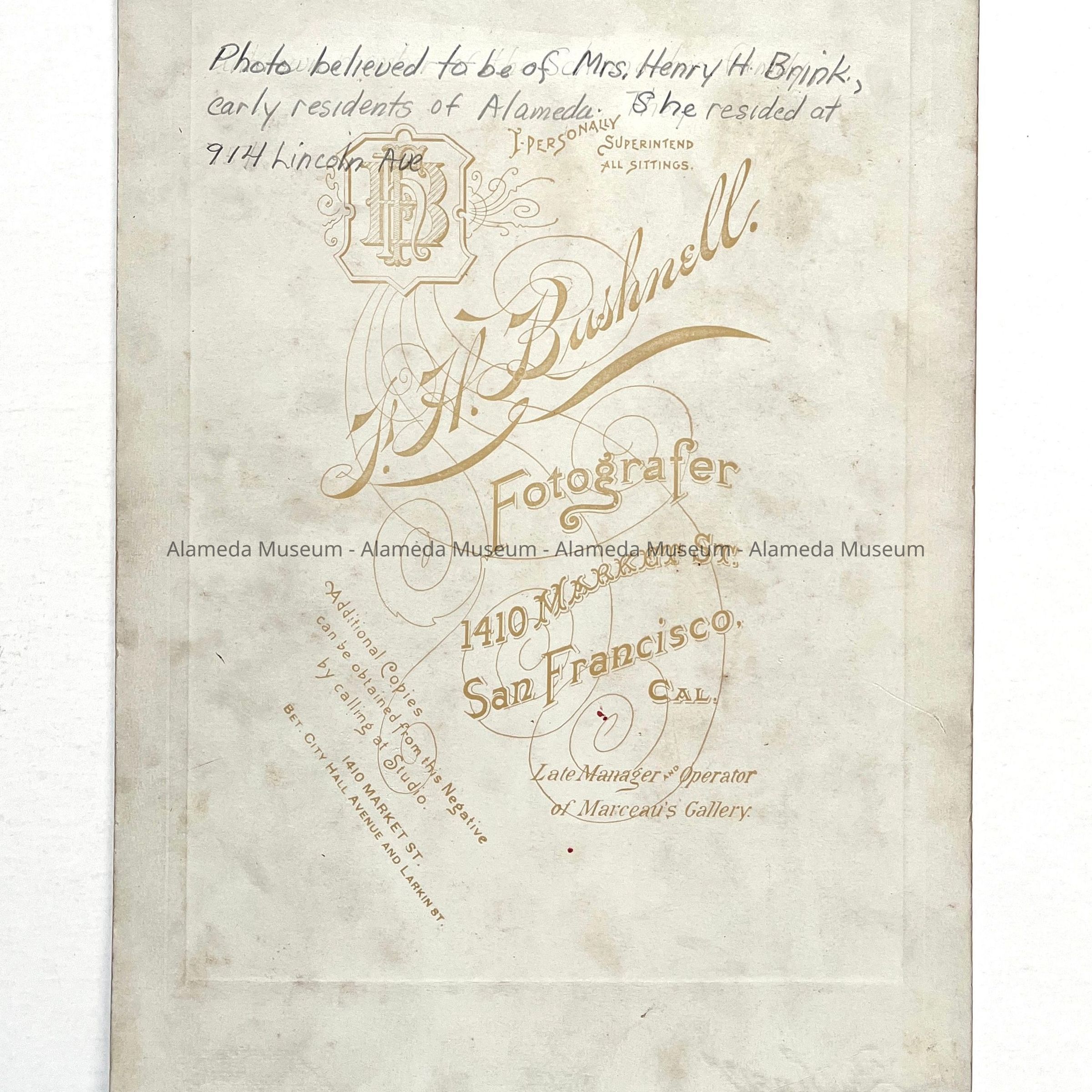 PHOTOGRAPH BELIEVED TO BE OF MRS HENRY BRINK, EARLY ALAMEDA RESIDENT. SHE RESIDED AT 914 LINCOLN AVENUE, AND WAS THE MOTHER OF MABEL BRINK SCHUMACHER.