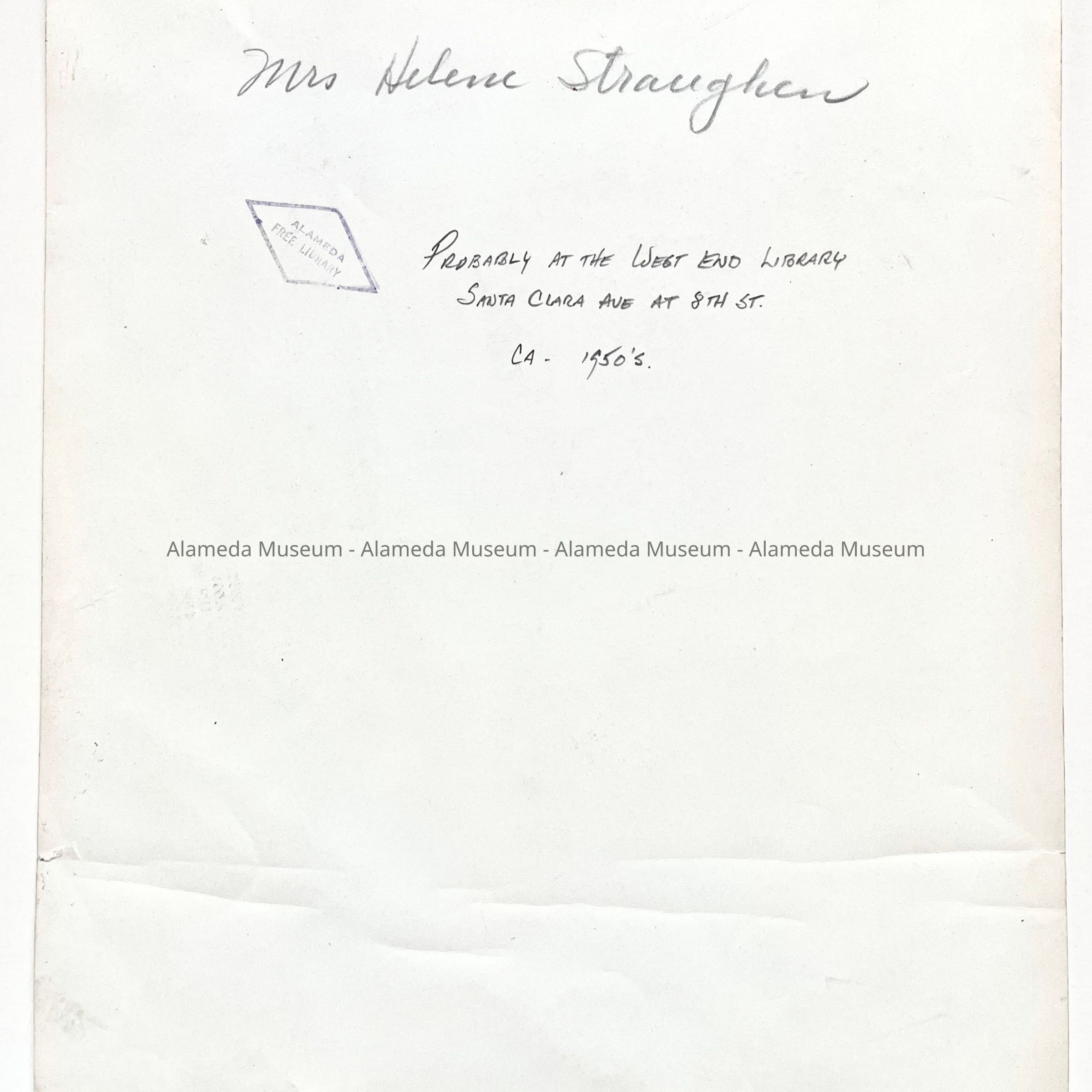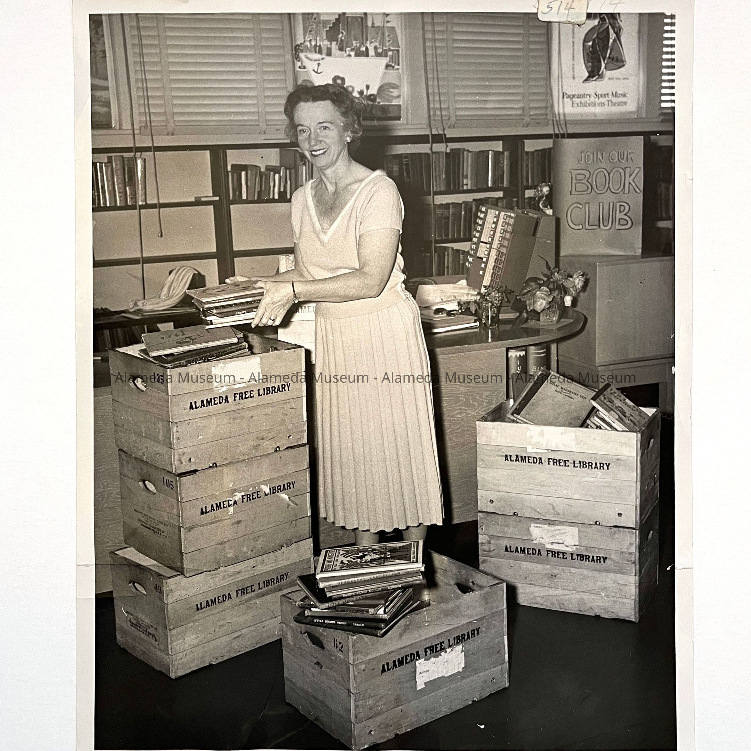 History of Object: Scene showing a librarian identified as Mrs. Helene Straughen unpacking children's books from wooden cartons at what is probably the West End Branch Library, located at Santa Clara Avenue and 8th Street.