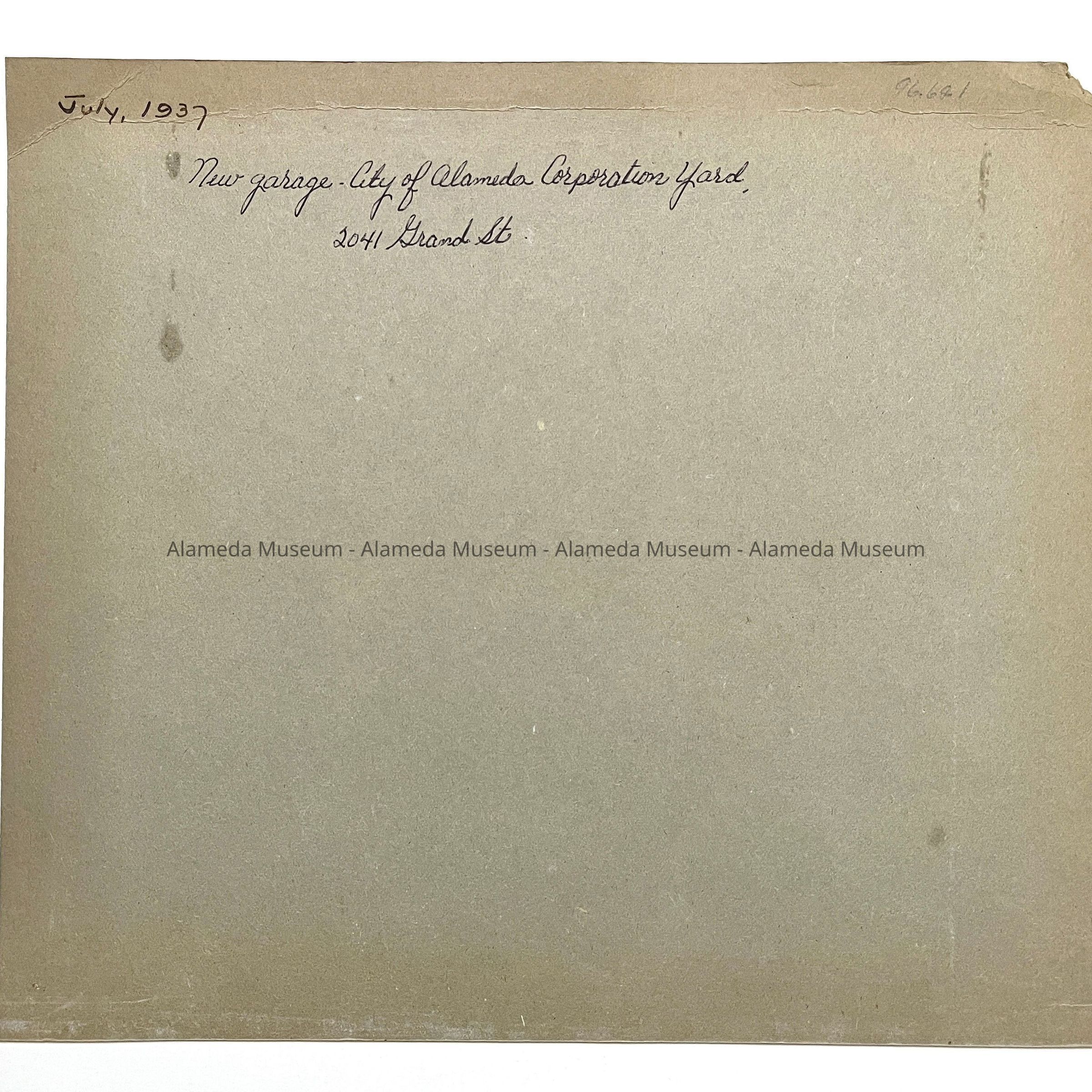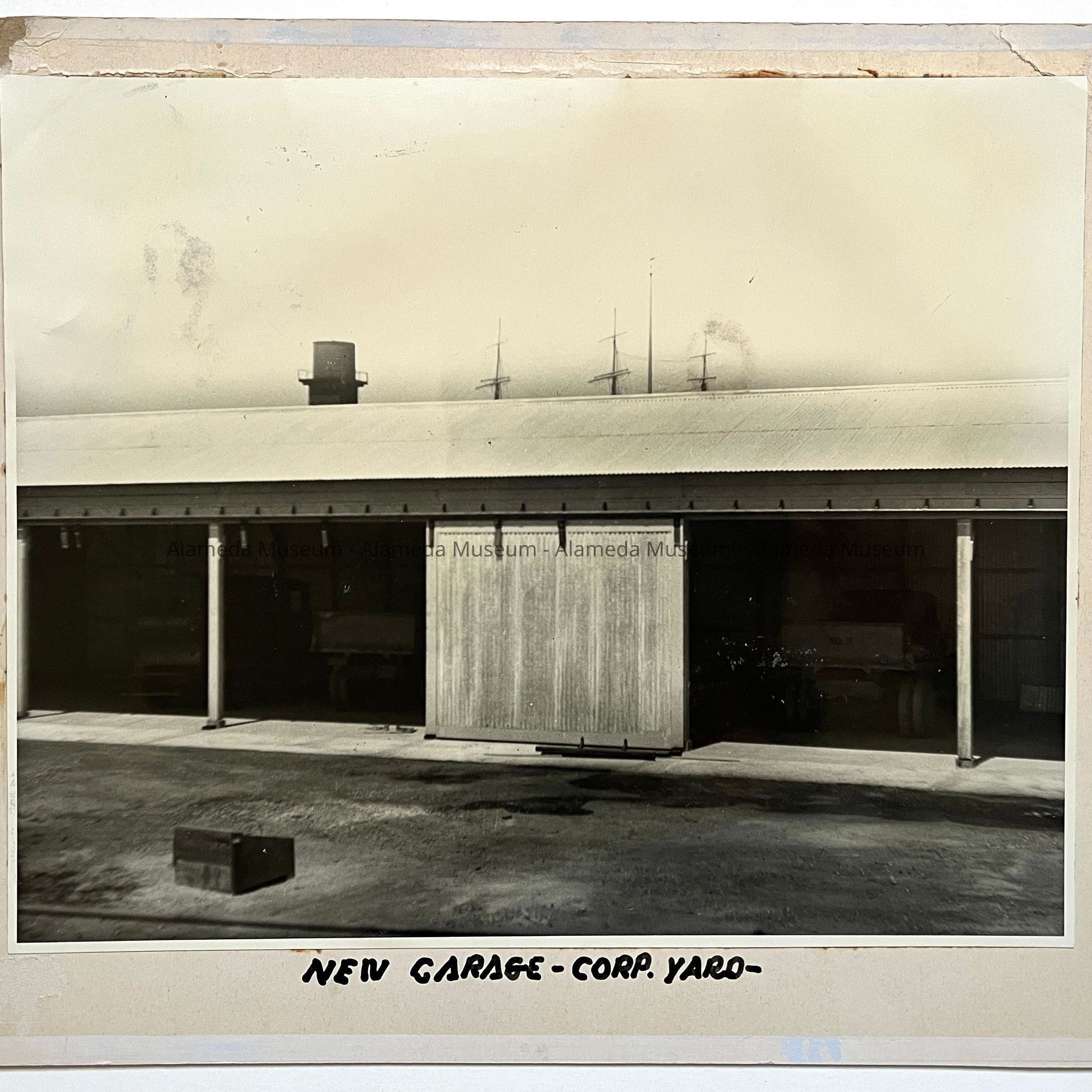 View of the new garage at the City of Alameda Corporation Yard, 2041 Grand St., July, 1937. The masts of what appears to be an Alaska Packers vessel appear in the background behind the garage structure. This is an enlarged version of Acc. No. 96.68.1(d).