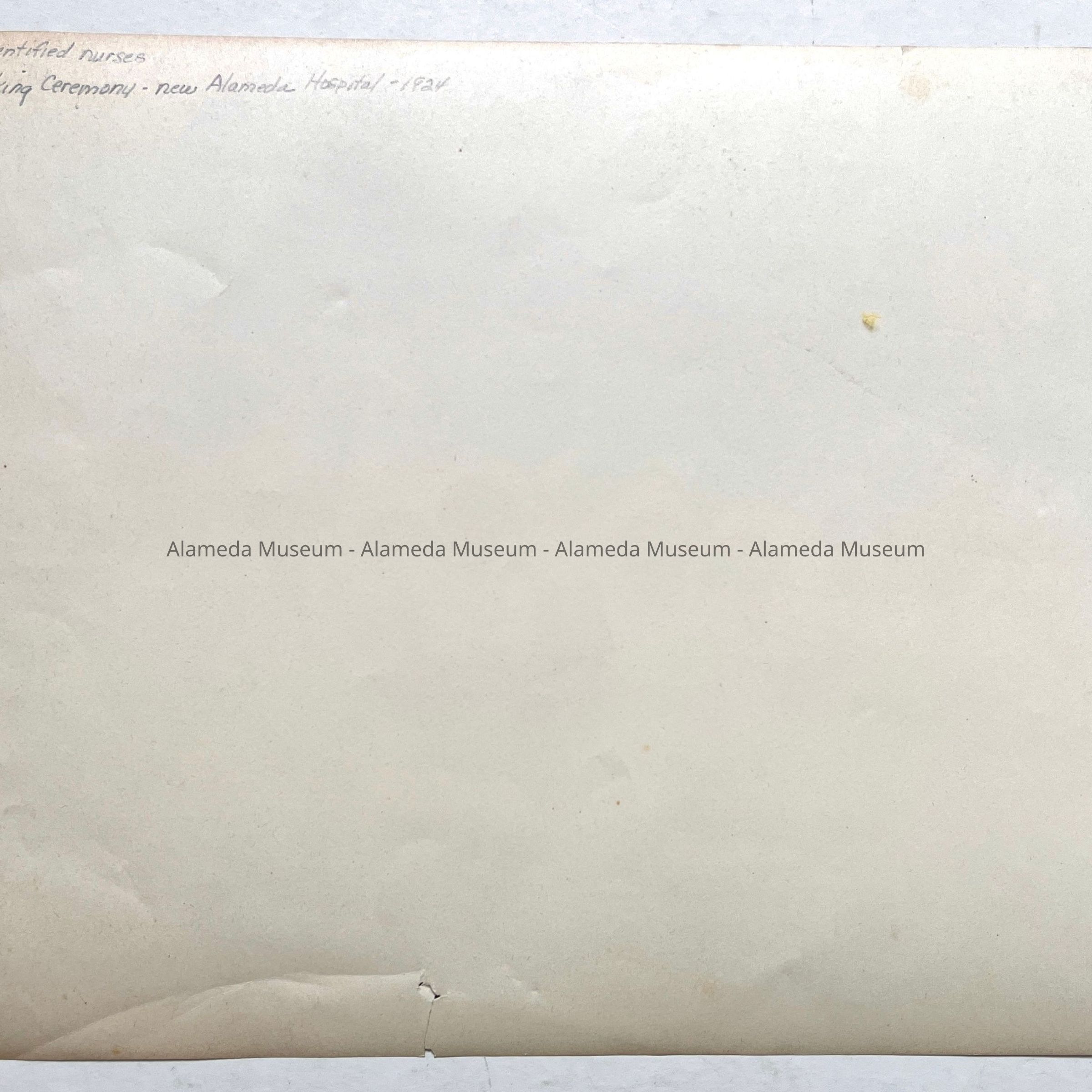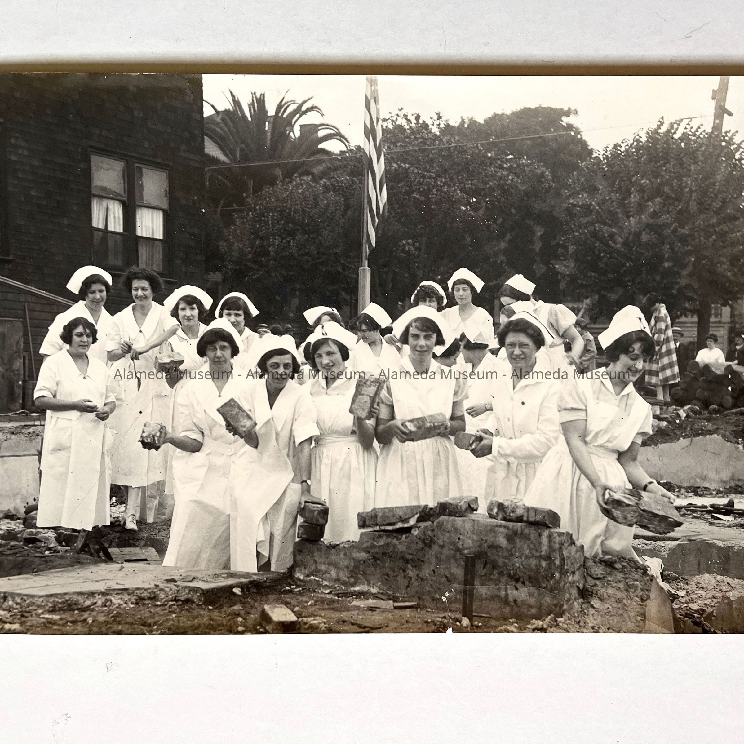 History: Photograph of a group of unidentified nurses in uniform at the groundbreaking ceremony for the construction of the new Alameda Hospital, 1924.
