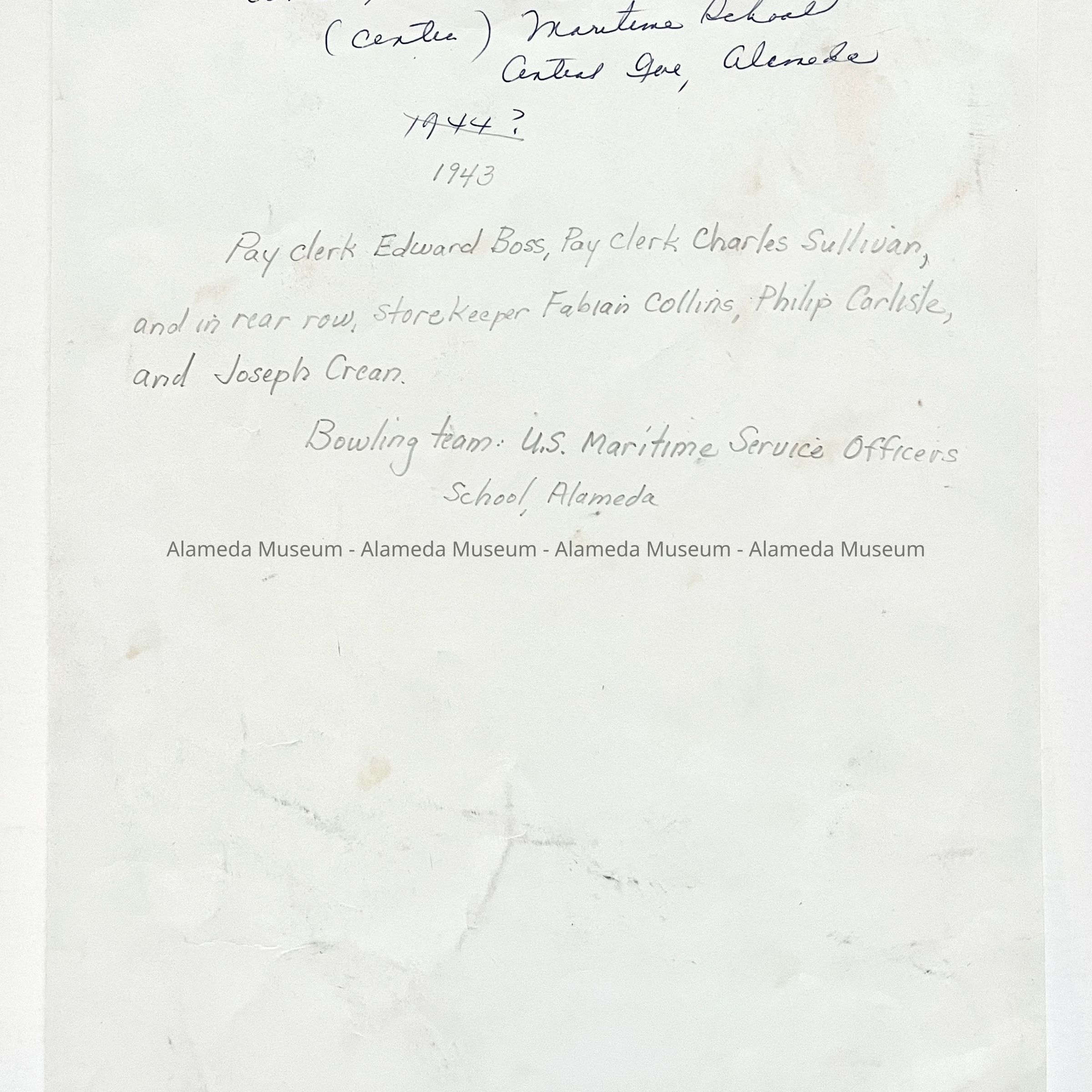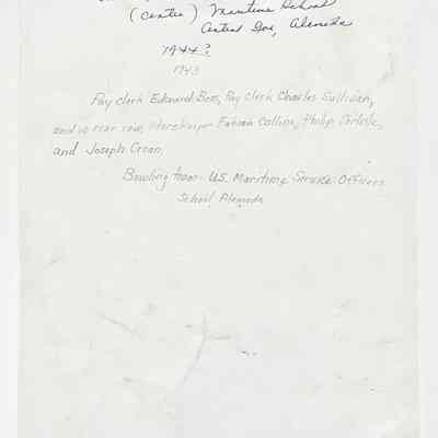 HISTORY OF OBJECT: A PHOTOGRAPH OF OFFICERS AND EMPLOYEES OF THE U.S. MARITIME SCHOOL, LOCATED ON CENTRAL AVENUE NEAR MCKAY STREET, CIRCA 1940. THE DONOR'S MOTHER, GERTRUDE ANNE SCHROEDER, IS PICTURED IN THE MIDDLE. SHE WORKED AS A STENOGRAPHER AND TYPIST AT THE SCHOOL.