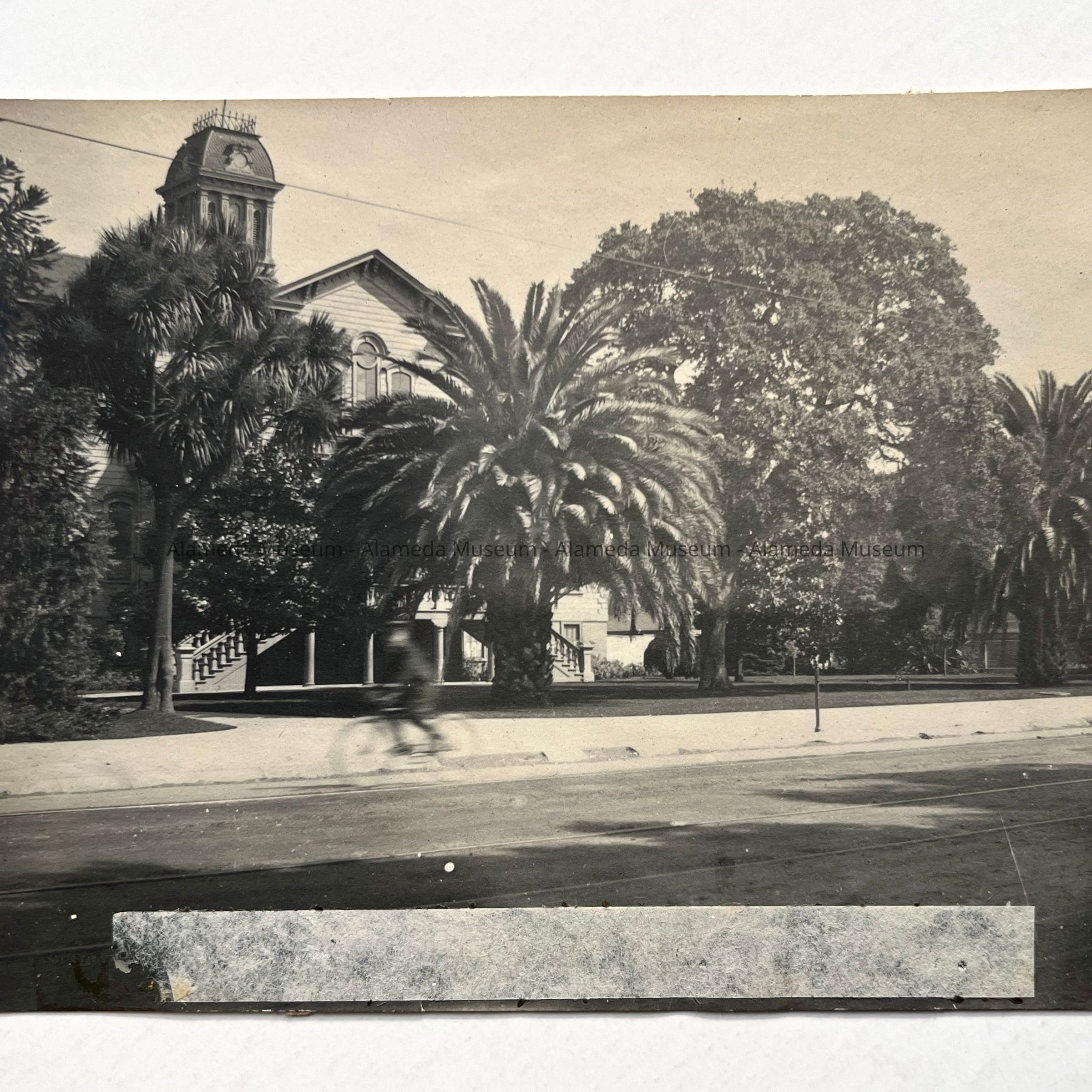 Description: Black/white photo with remnants of tan scrapbook paper on verso. Photographer unknown. A remnant of a white taped label (L-1/2 x W-3 in.) runs along the bottom edge.