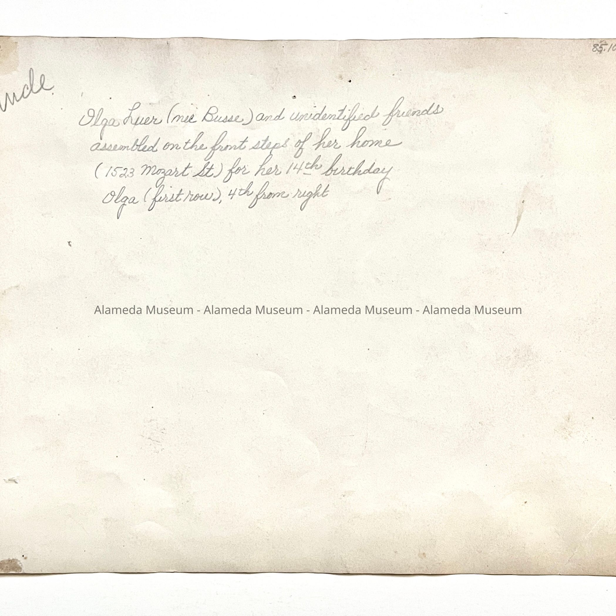 History of Object: Photo of Olga Luer (nee Busse) and unidentified friends assembled on the front steps of her home (1523 Mozart Street) for her 14th birthday.