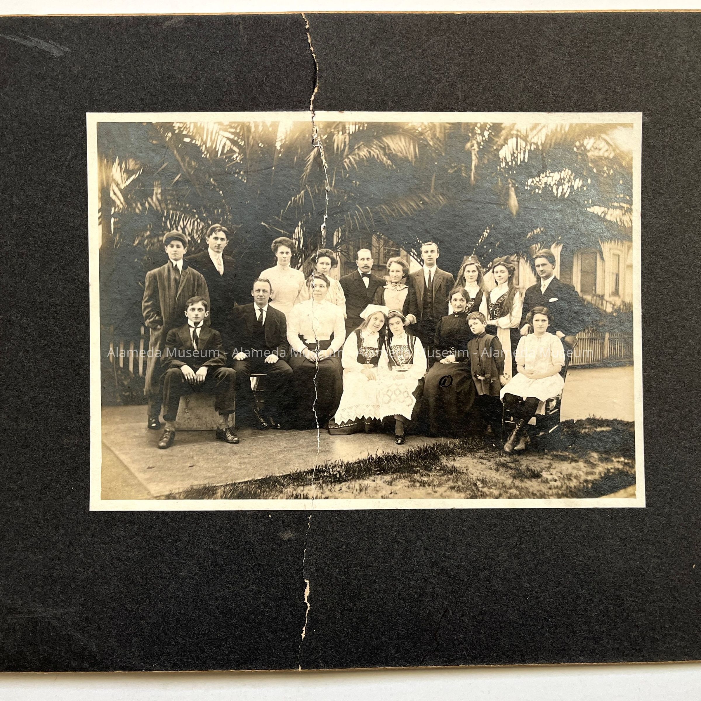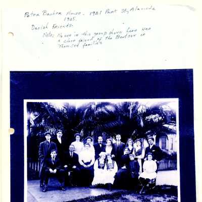 GROUP OF INDIVIDUALS, SOME IN DANISH COSTUMES, PICTURED IN FRONT OF THE HOME OF THORVALD BACHER, MUSIC TEACHER, 1912 PARK STREET (NOW DEMOLISHED). THE HOME WAS A GATHERING SPOT IN THE EARLY 1900'S FOR MANY DANES COMING TO THE BAY AREA. IT WAS ALSO SITE OF MANY PARTIES AND MUSICALS.