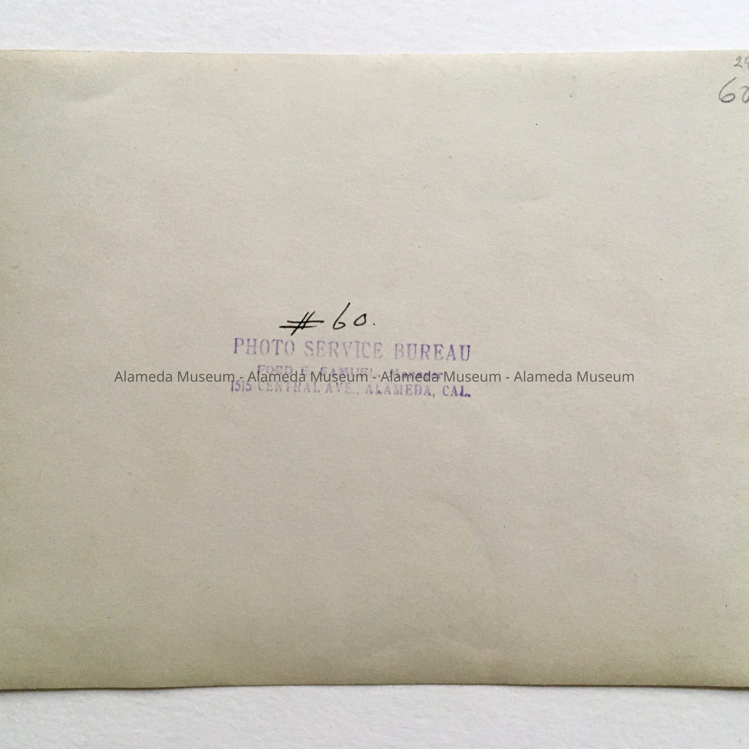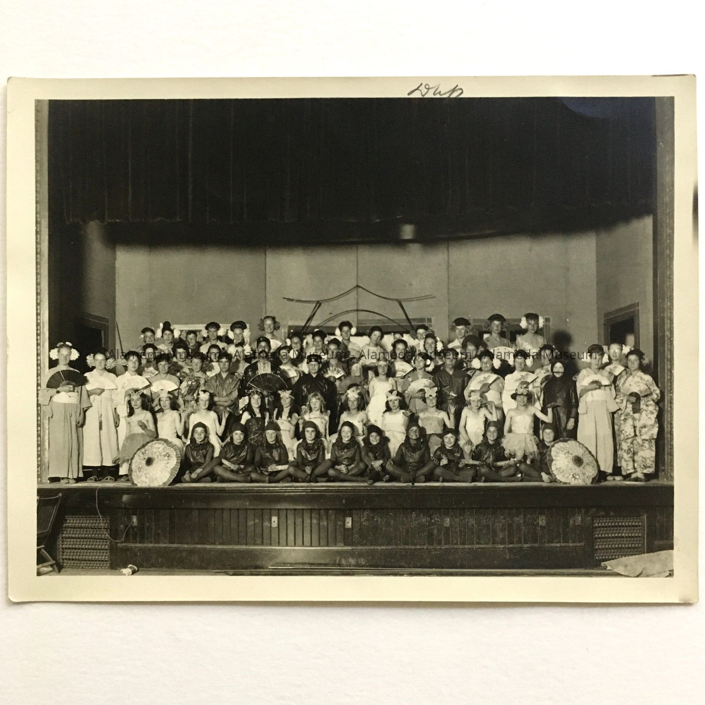 Description: Non-glossy photo of a large group of young people, dressed in costumes, including Japanese style Kimonos, and parasols, posed in tiers on a stage. Numbered #60 on verso. Photographers stamp on the back states: Photo Service Bureau / Ford E. Samuel, Manager / 1515 Central Ave, Alameda, Cal.