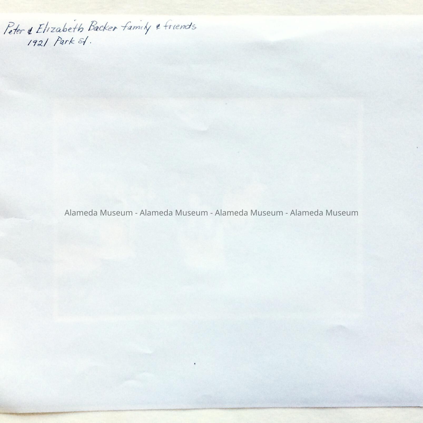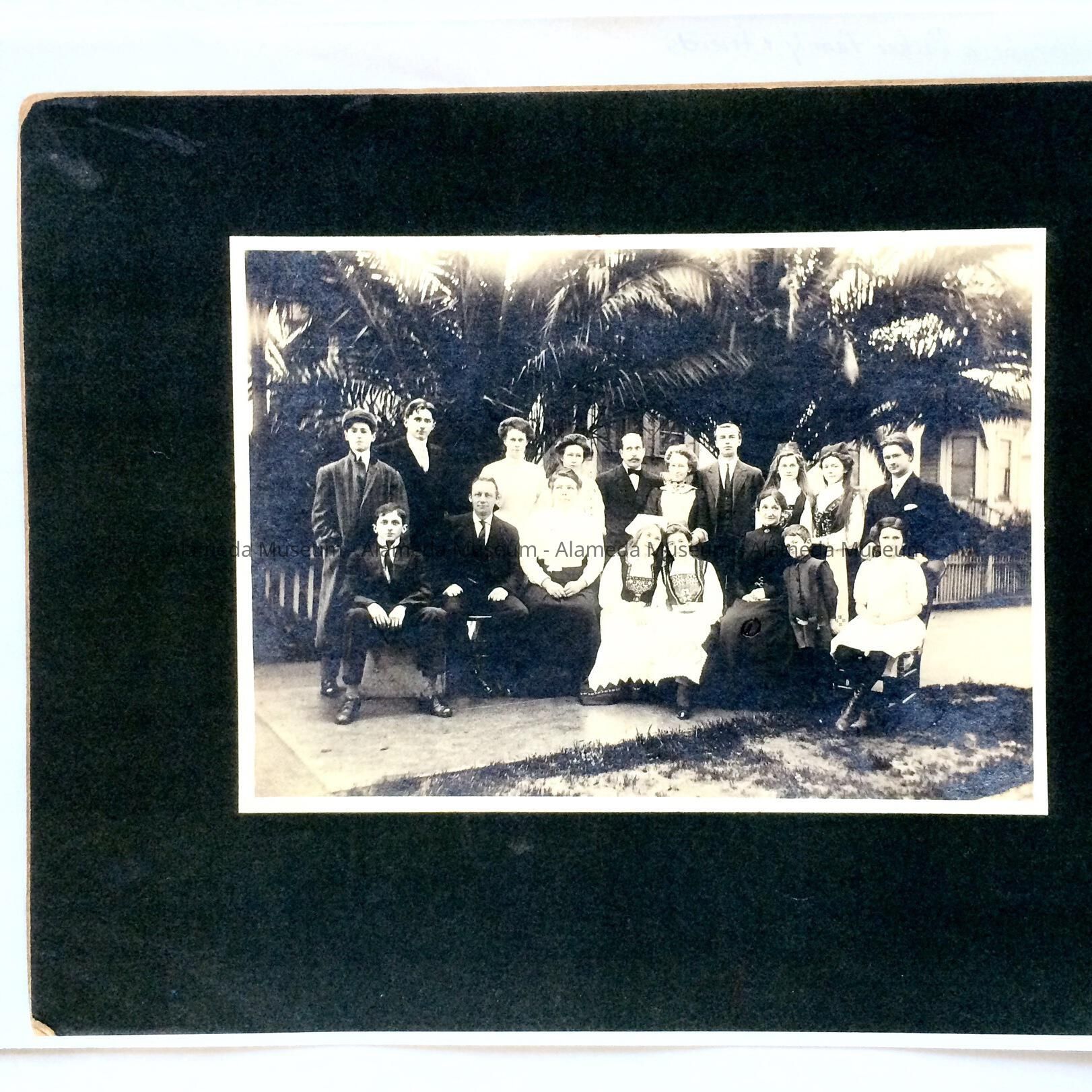 A PHOTOGRAPH OF PETER AND ELIZABETH BACHER WITH FAMILY AND FRIENDS IN FRONT OF THEIR HOME AT 1921 PARK STREET. THEY WERE MEMBERS OF THE DANISH COMMUNITY. FOUR WOMEN AMONG THE GROUP ARE WEARING TRADITIONAL DANISH COSTUMES.