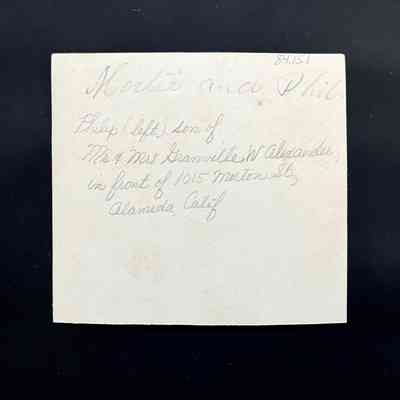 Photo of Philip (left), son of Mr. & Mrs. Granville W. Alexander, in front of 1015 Morton Street, Alameda.
