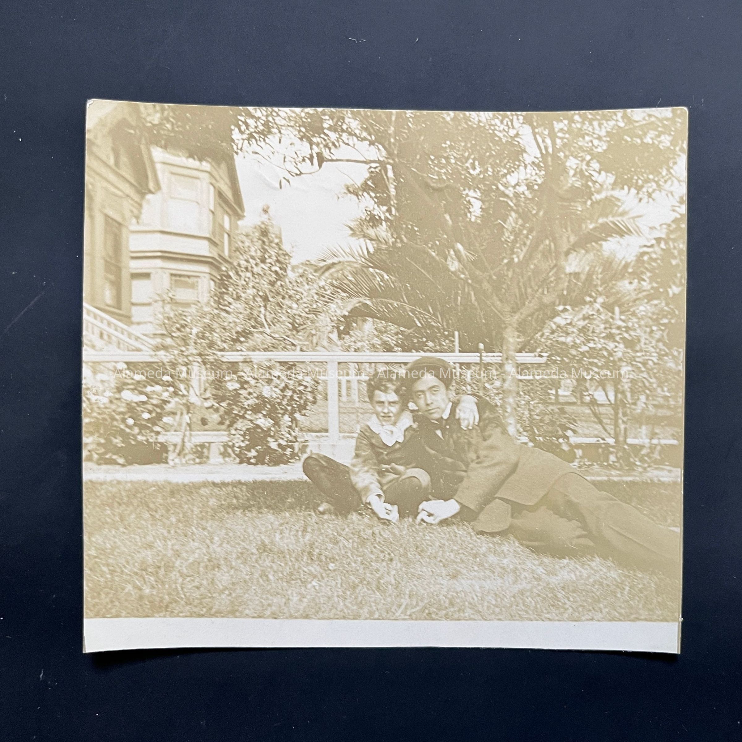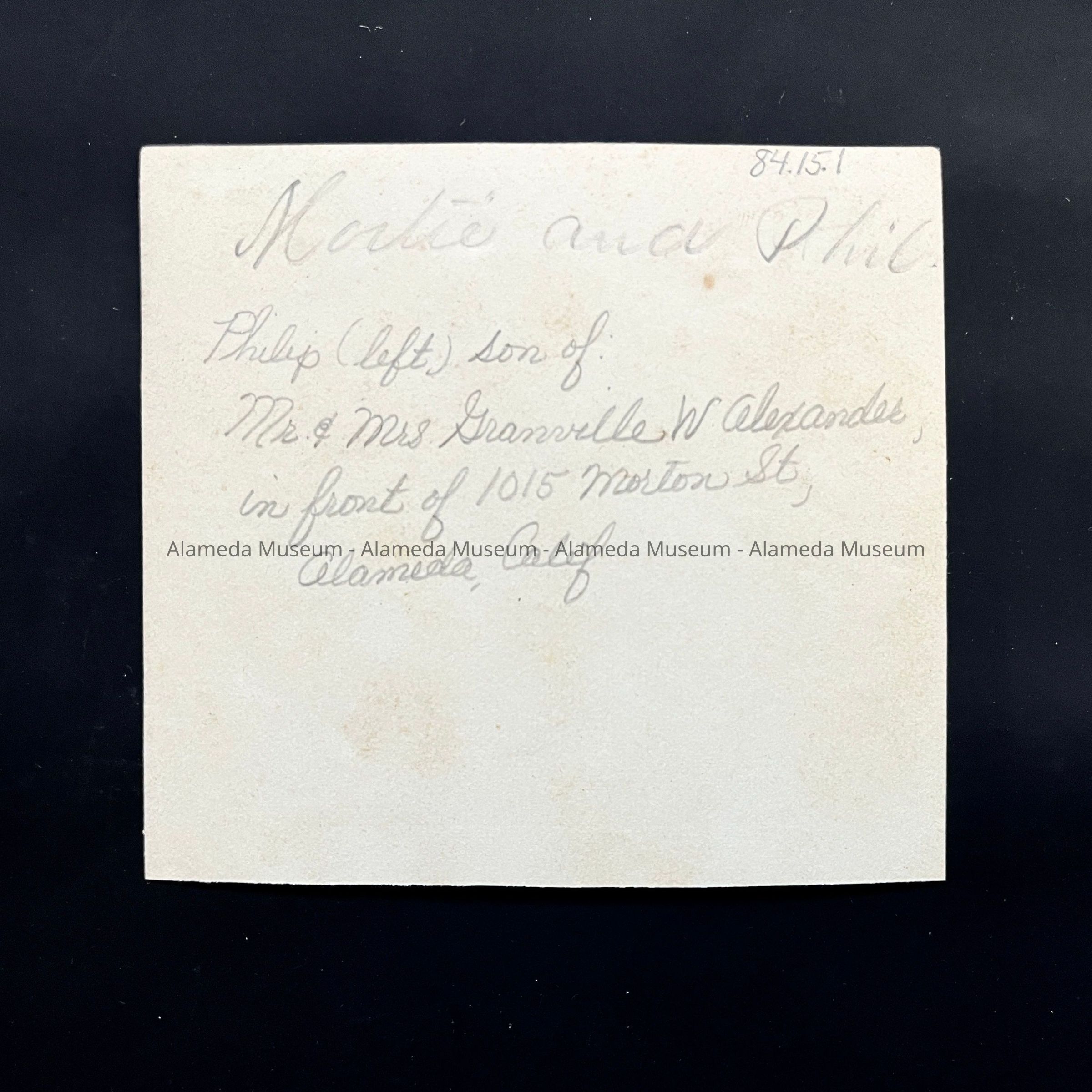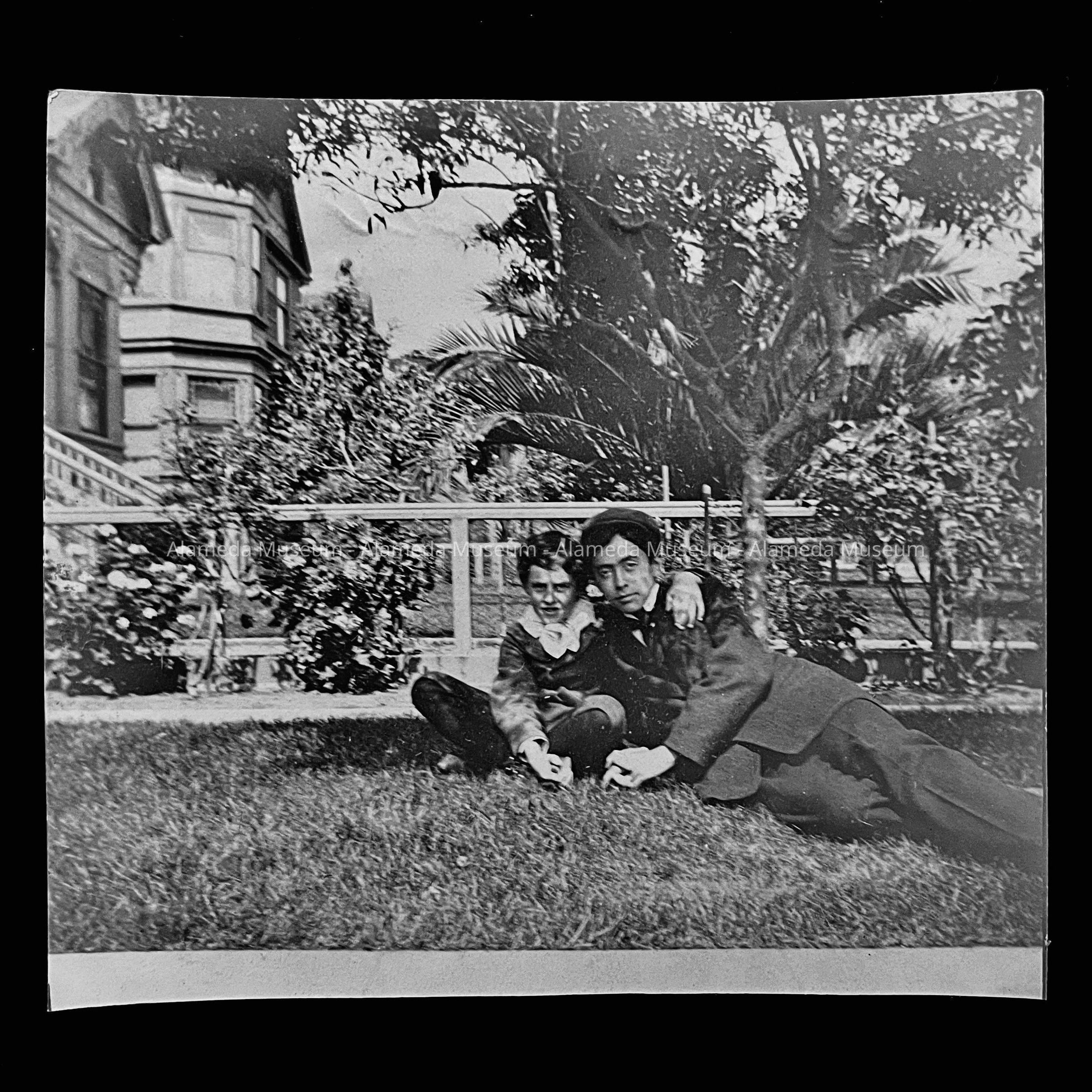 History of Object: Photo of Philip (left) son of Mr. & Mrs. Granville. W. Alexander, in front of 1015 Morton Street, Alameda. The family rented the home from approximately 1894 to 1906, after which they moved to San Francisco.