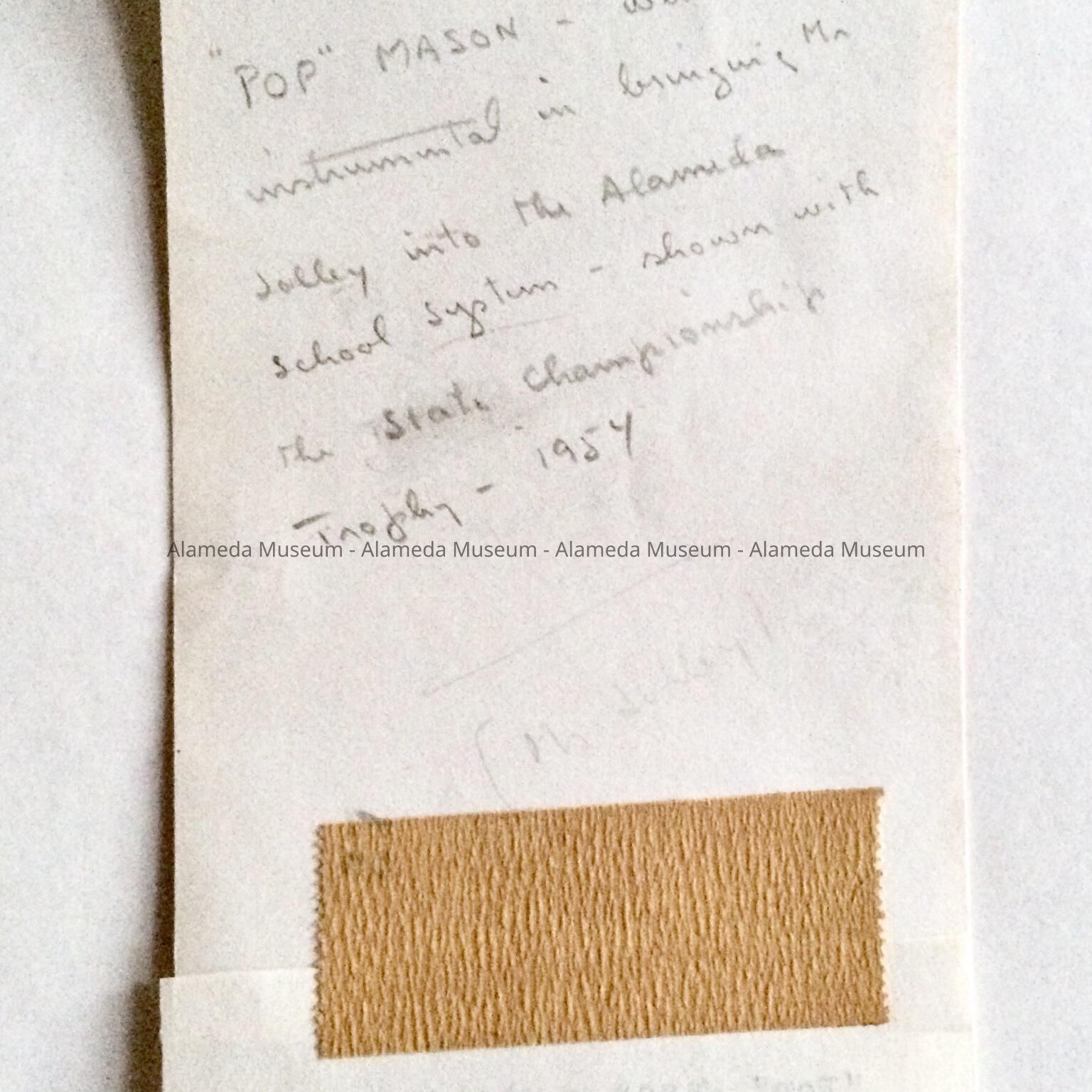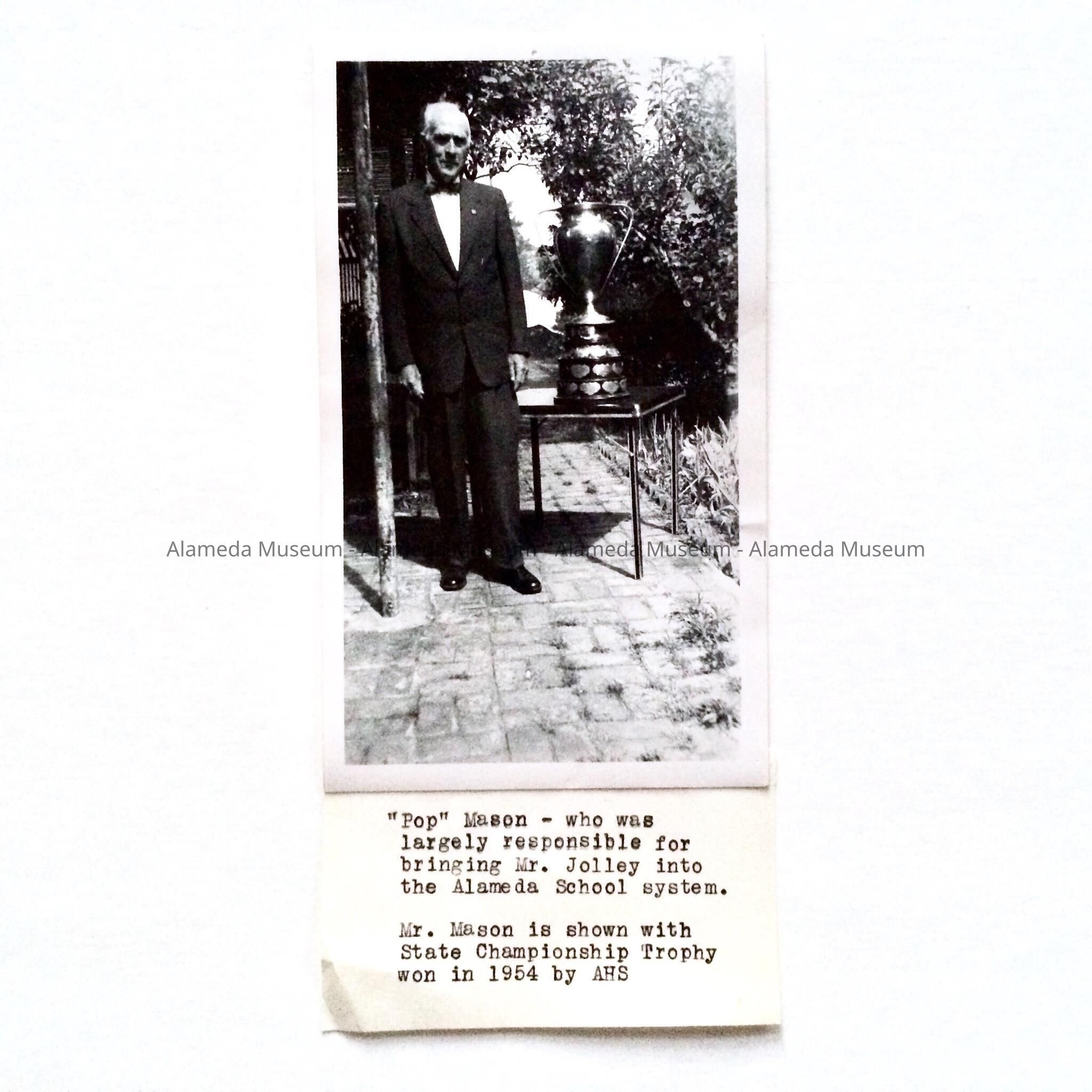 A PHOTOGRAPH OF "POP" MASON, WHO WAS LARGELY RESPONSIBLE FOR BRINGING MR LEWIS C JOLLEY INTO THE ALAMEDA SCHOOL SYSTEM. MR MASON IS SHOWN WITH A STATE CHAMPIONSHIP TROPHY WON IN 1954 BY AN ALAMEDA HIGH SCHOOL TEAM.