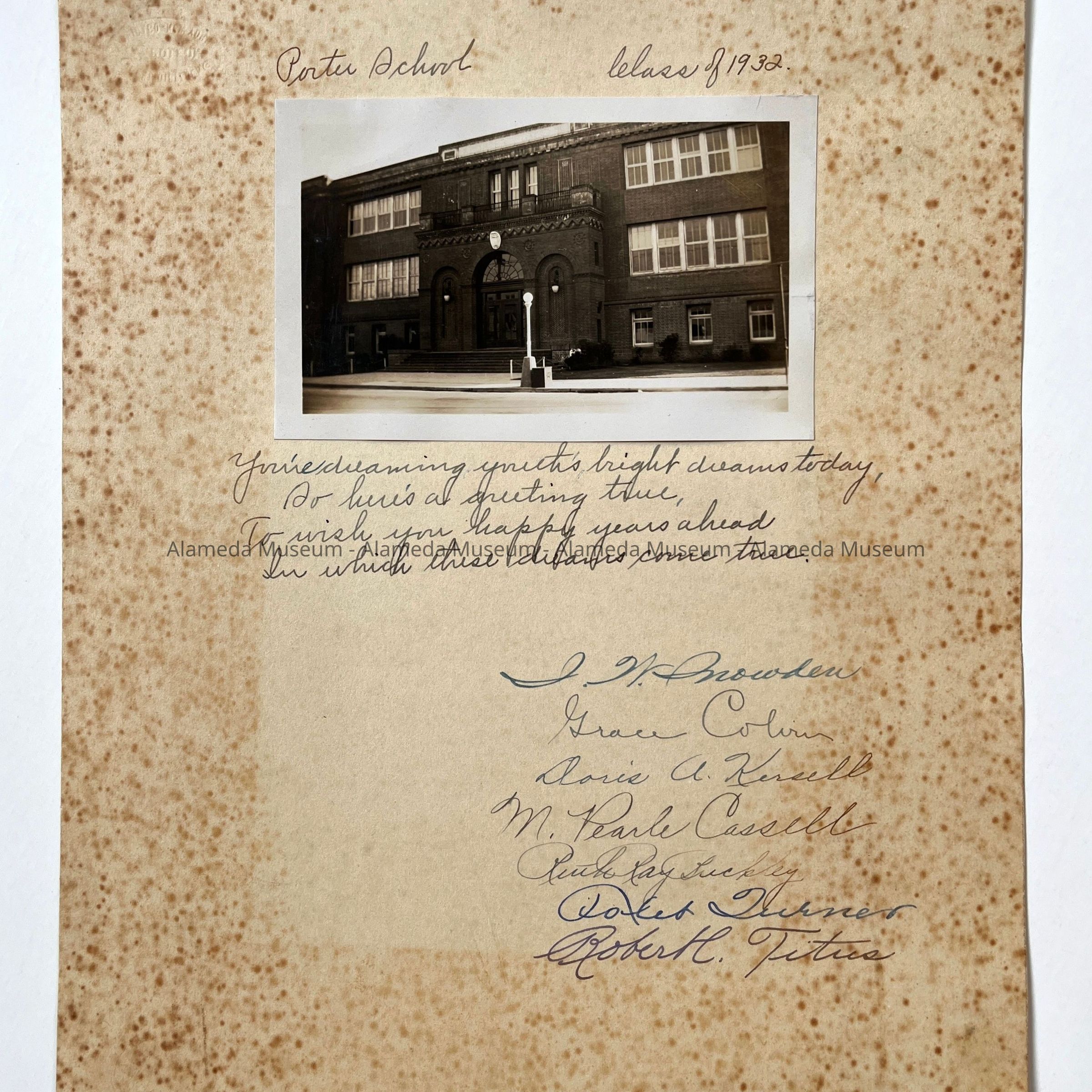 Photo of Porter School entrance, autographed by teachers, c. 1932Entry/Object ID