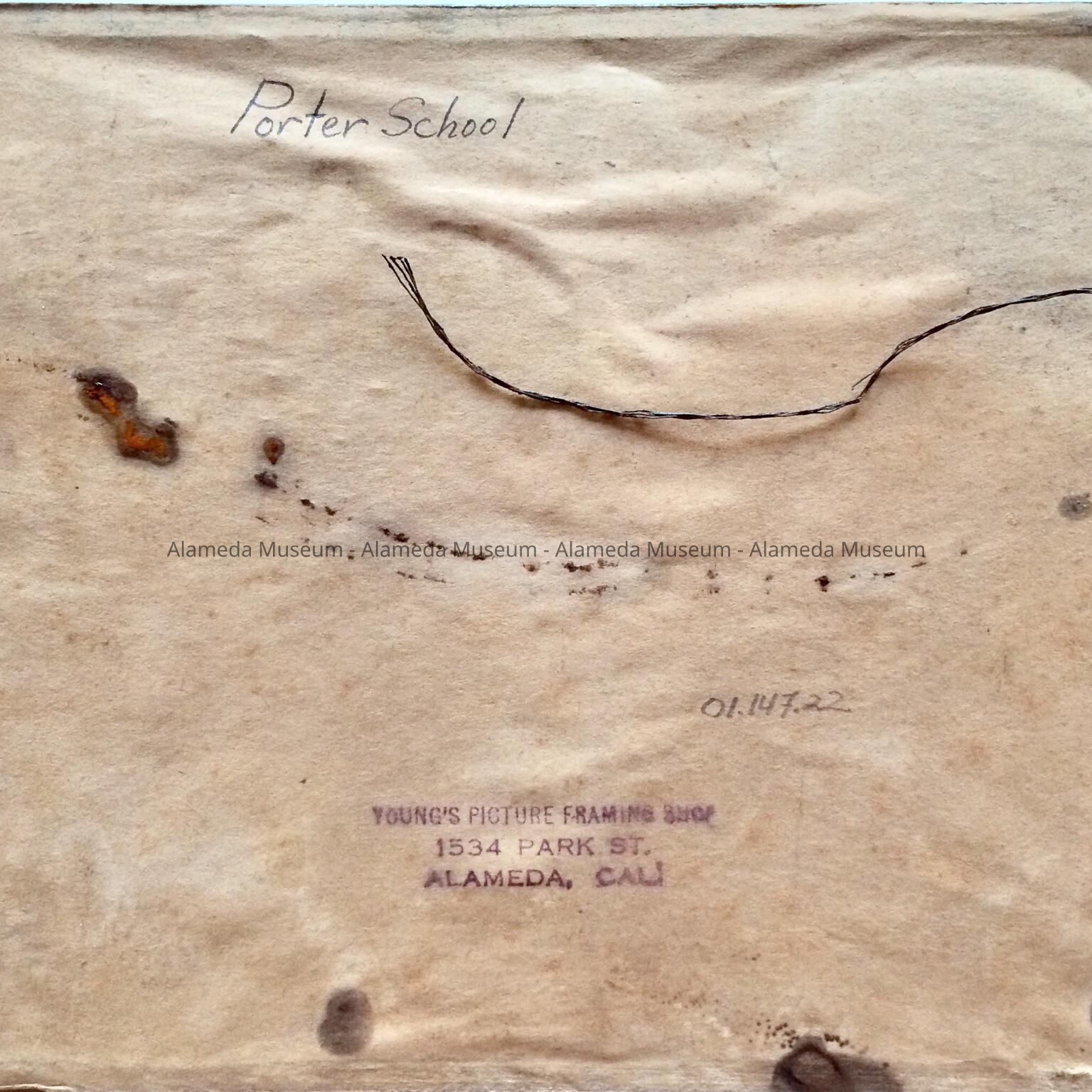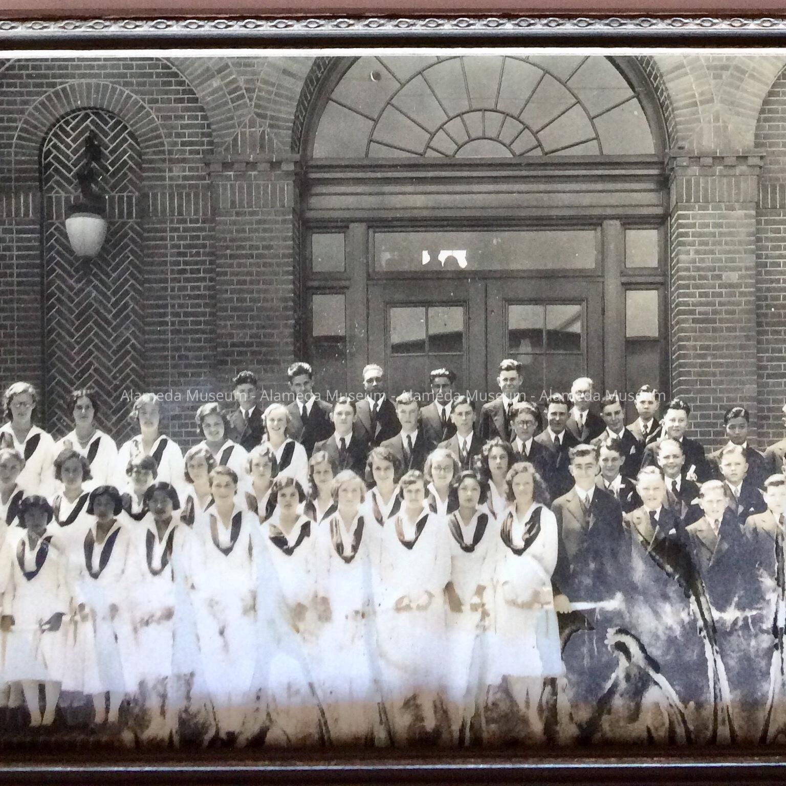 HISTORY OF OBJECT: PHOTOGRAPH OF THE GRADUATING CLASS PICTURED STANDING AT THE MAIN ENTRANCE OF PORTER SCHOOL IN ALAMEDA. PHOTO WAS FRAMED BY YOUNG'S PICTURE FRAMING SHOP, 1534 PARK STREET, ALAMEDA, CA.
