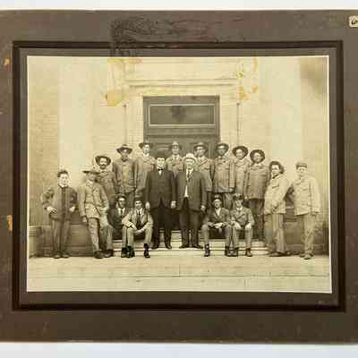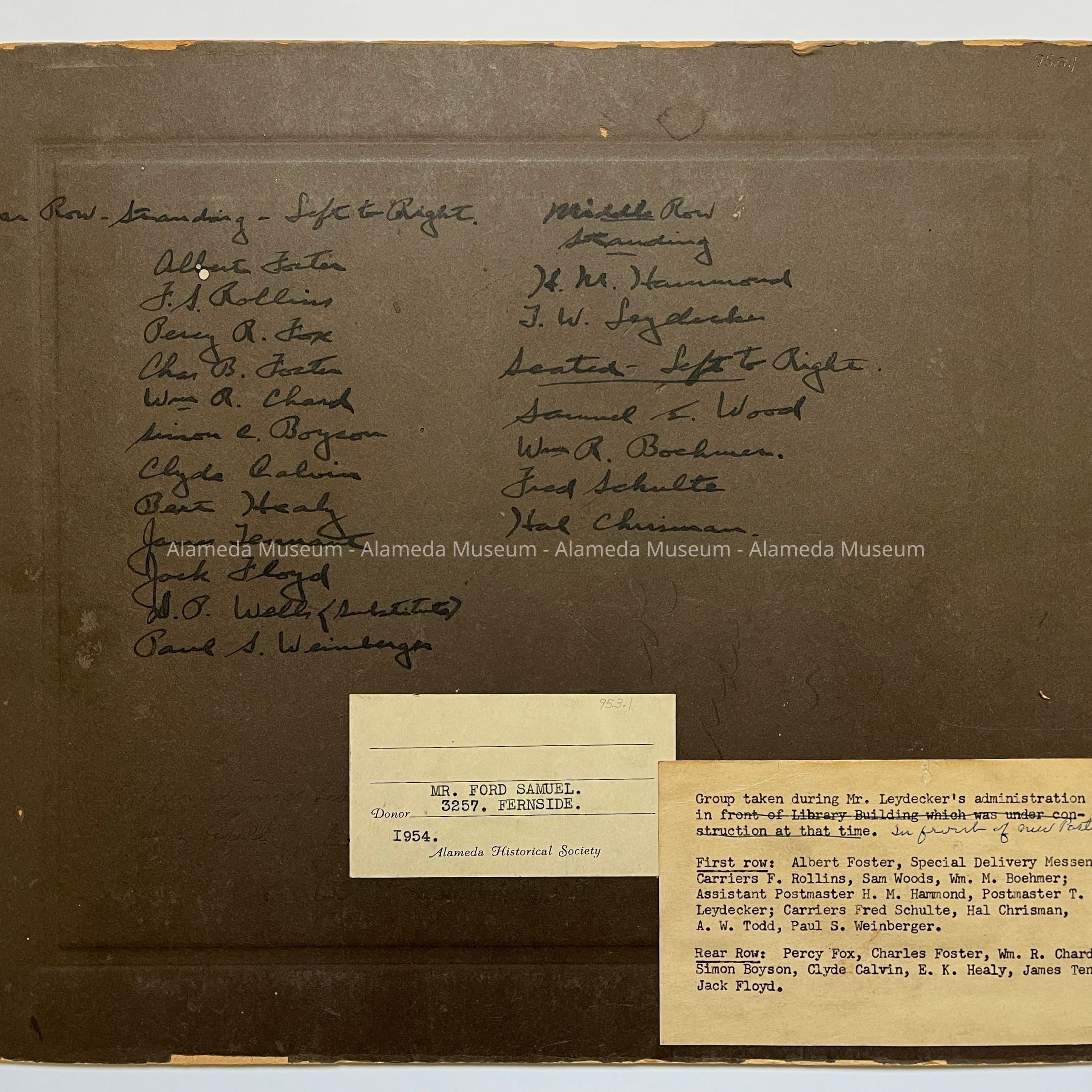 Postmaster Theo. Wm. Leydecker and mail carriers in official uniforms - Group photo on steps of Alameda Free Library. Names are included on reverse.
