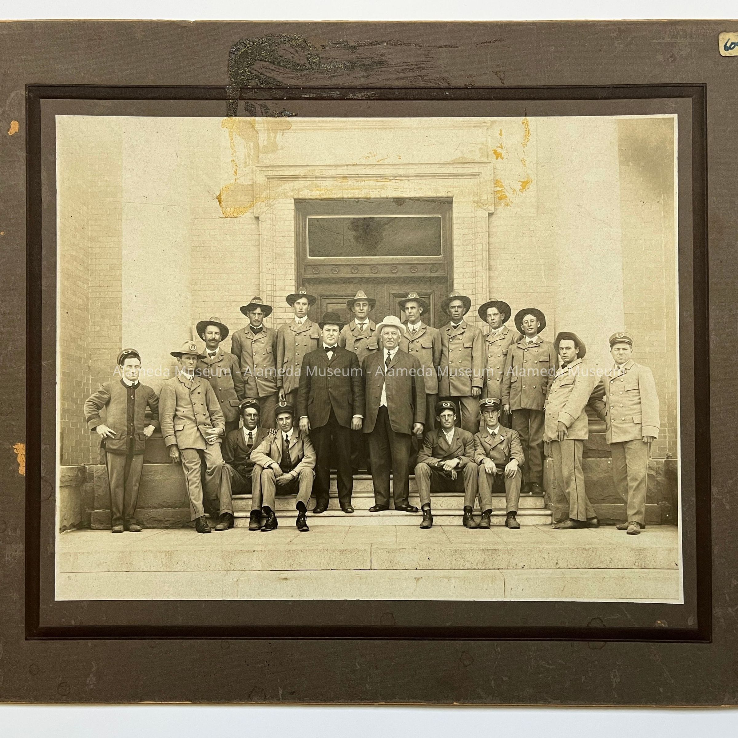 Photo of postmaster Leydecker and mail carriers on steps Alameda Free Library, c. 1909Entry/Object ID