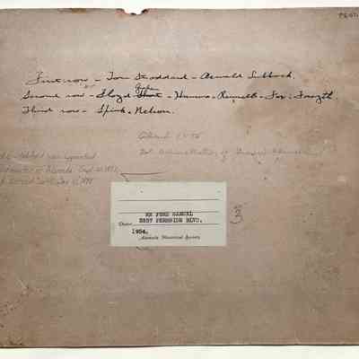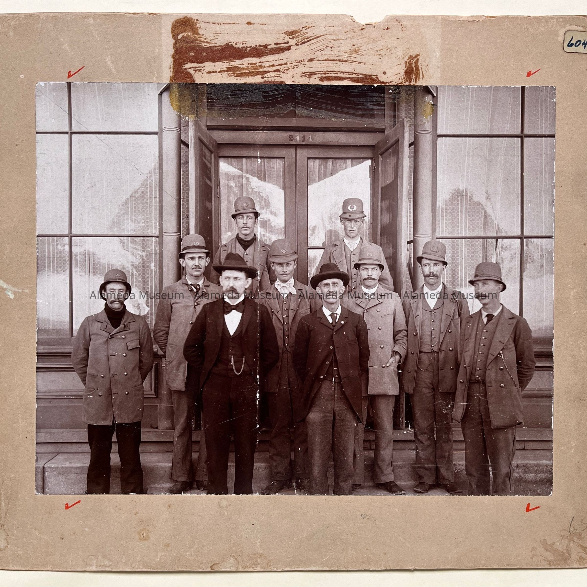 Description: Sepia-toned albumen print photo mounted on it. tan paperboard. Photographer unknown. Glue staining abt. L-2 x W-5 in covers the upper 1 in. of the image as well as the entire center section of the upper margin of the mounting. Also, the mounting has an old cataloging sticker in its upper right corner, nail holes, and a missing lower right corner point. The image has a vertical scratch near its midsection, extending for the full length.