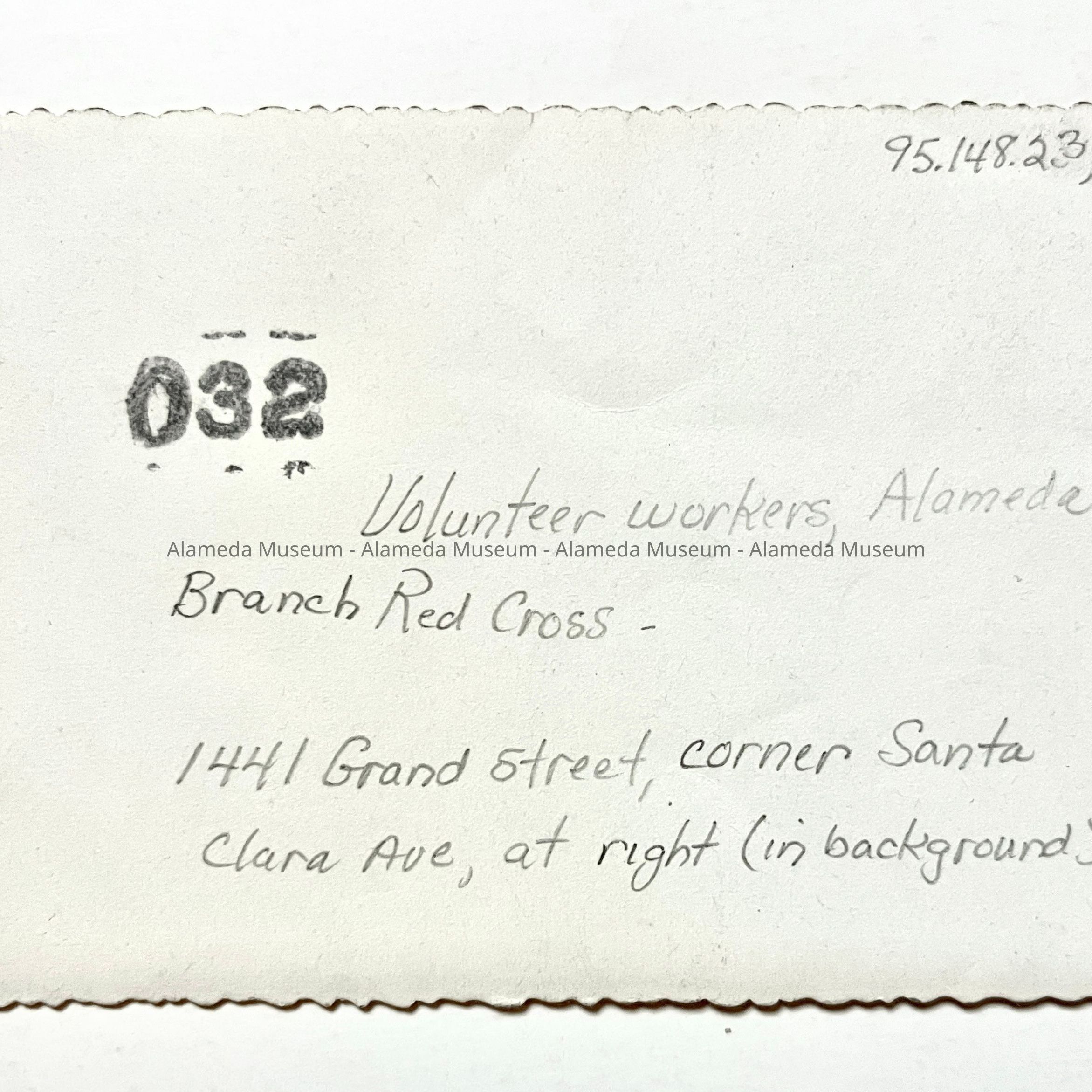 Photograph of volunteers of the Red Cross, alameda Branch, posing in front of a Red Cross vehicle. In background can be seen 1441 Grand Street, corner Santa Clara.