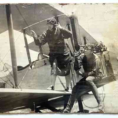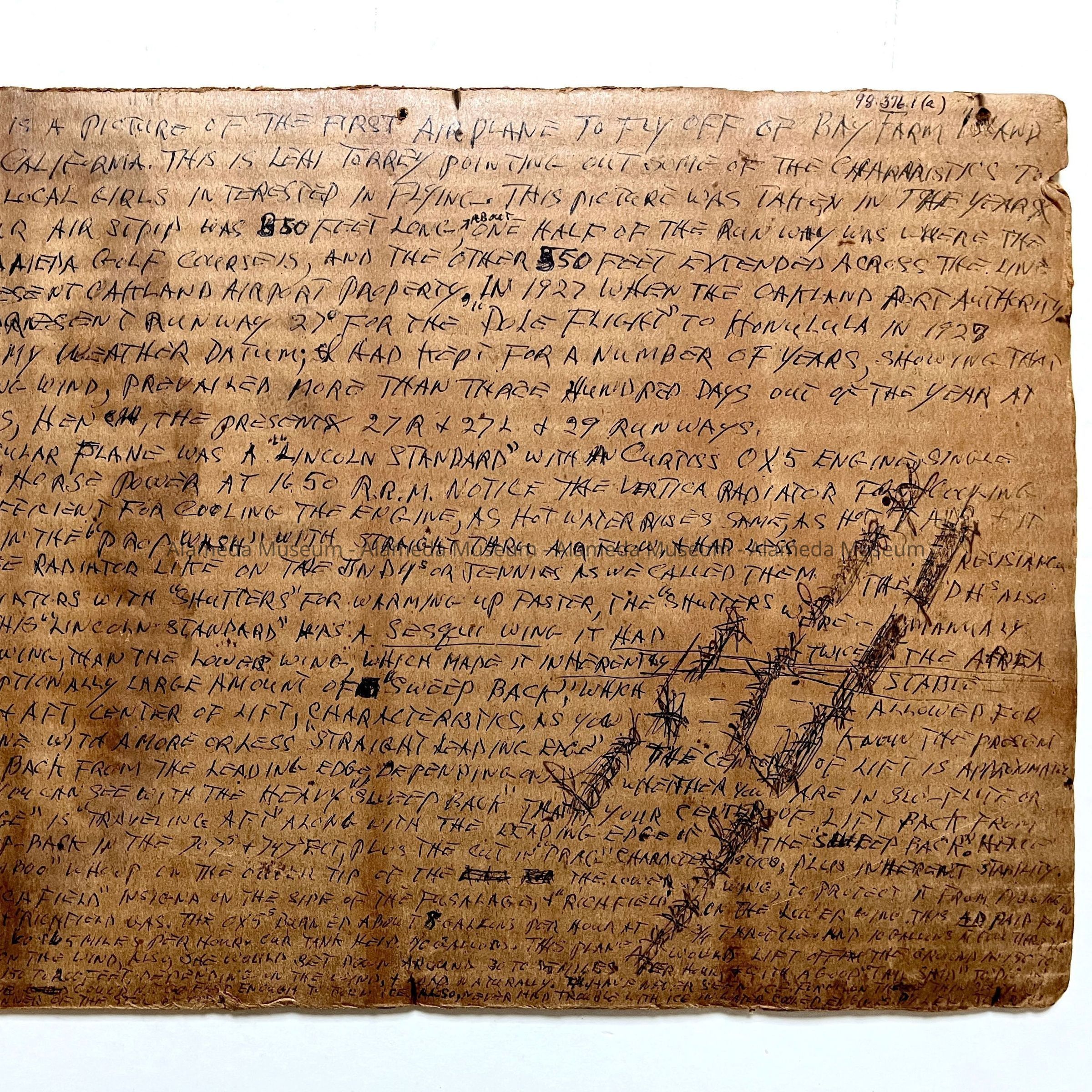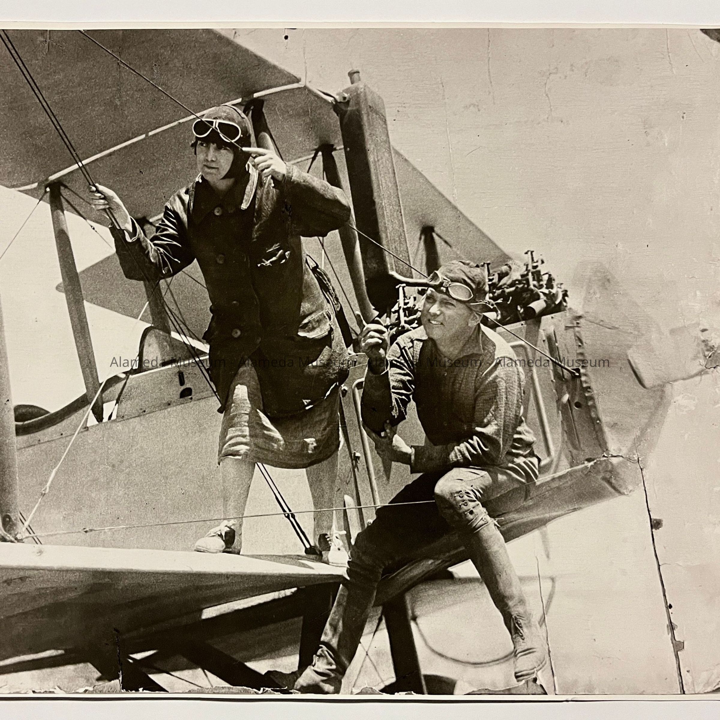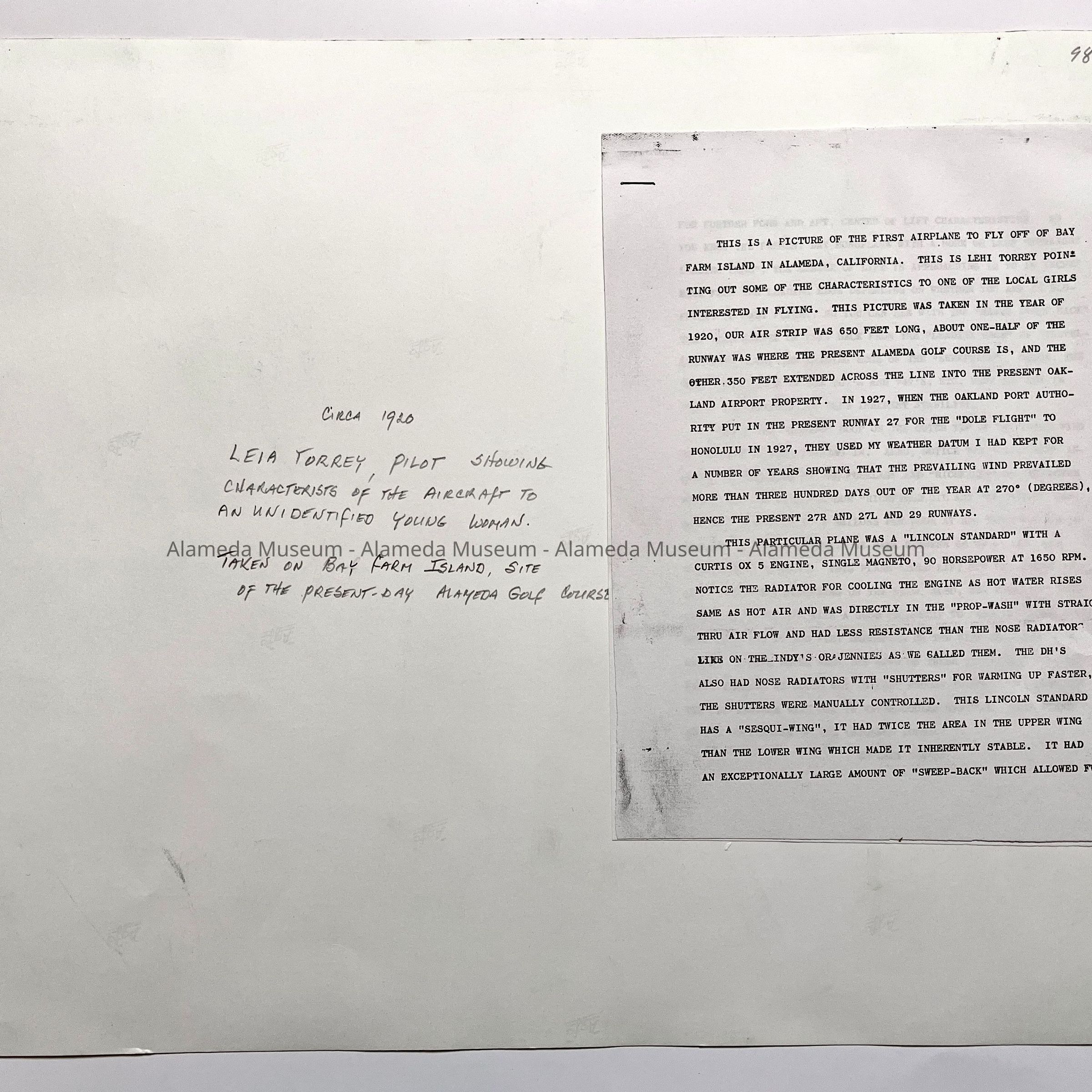 History of Object: Photographs of the reputably first airplane to fly off Bay Farm Island from a runway that is now presently the Alameda Golf Course. Pilot Lehi Torrey is seated on a wing of the plane pointing out characteristics of the aircraft to an unidentified young woman. A great deal of technical information about the plane is hand printed on the verso of image #a.