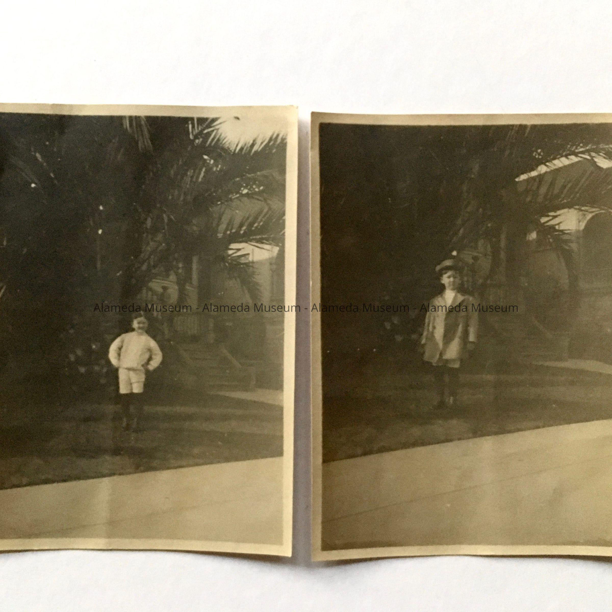 Description: two sepia photos of a boy, dressed in different clothes, in a front yard with a large palm tree. Remnants of backing or photo album page paper are on the back.