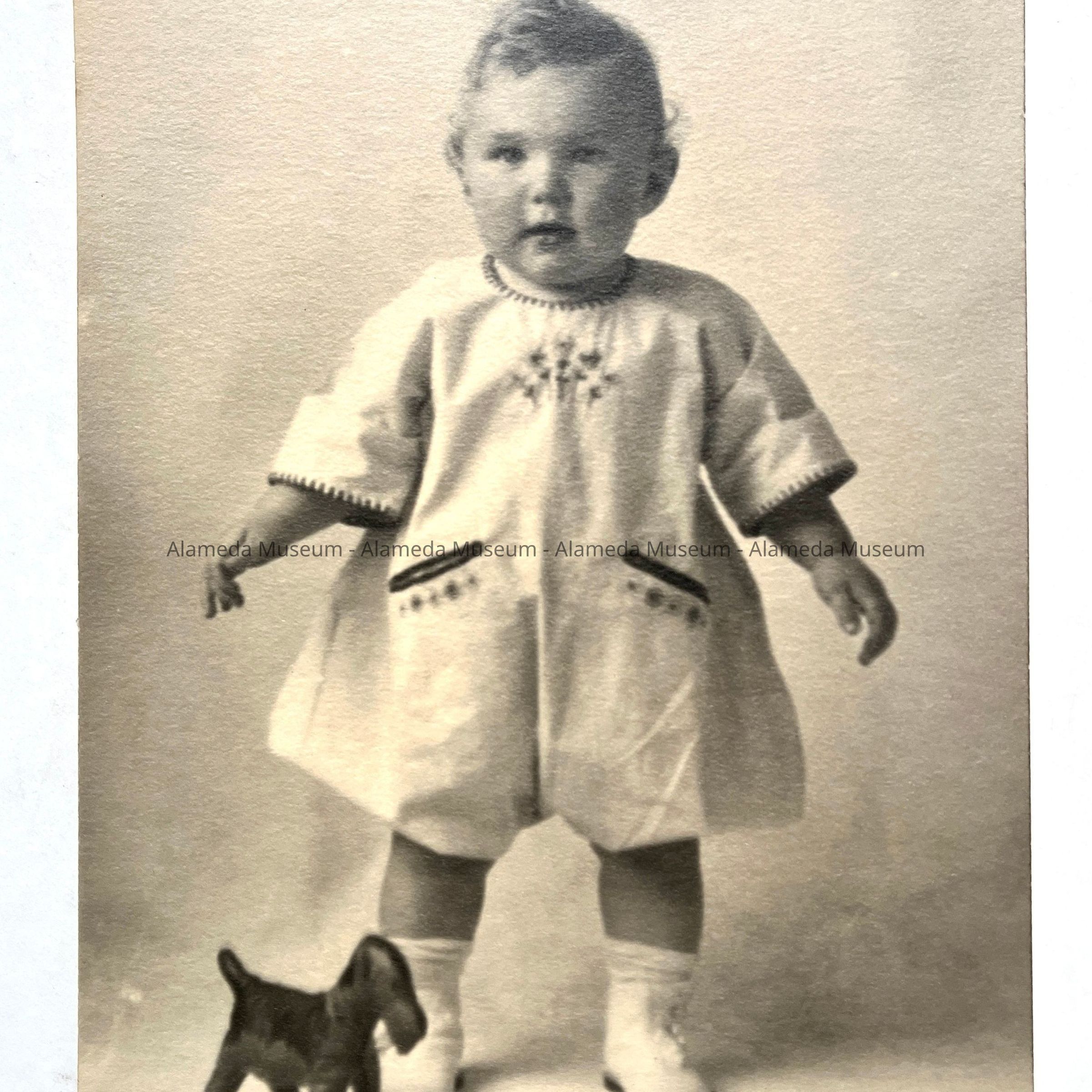 History of Object: Cute photo of infant Robert Bierwith, 1 year old, standing beside his toy dog.