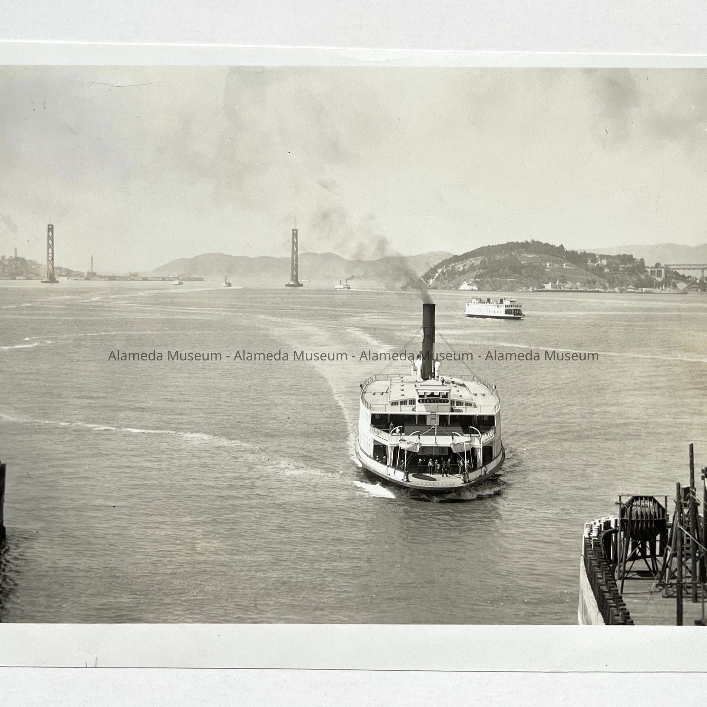 History of Object: Southern Pacific ferry boat “Berkeley" approaching the Alameda Mole. Yerba Buena Island and the uncompleted Bay Bridge are seen in the background.