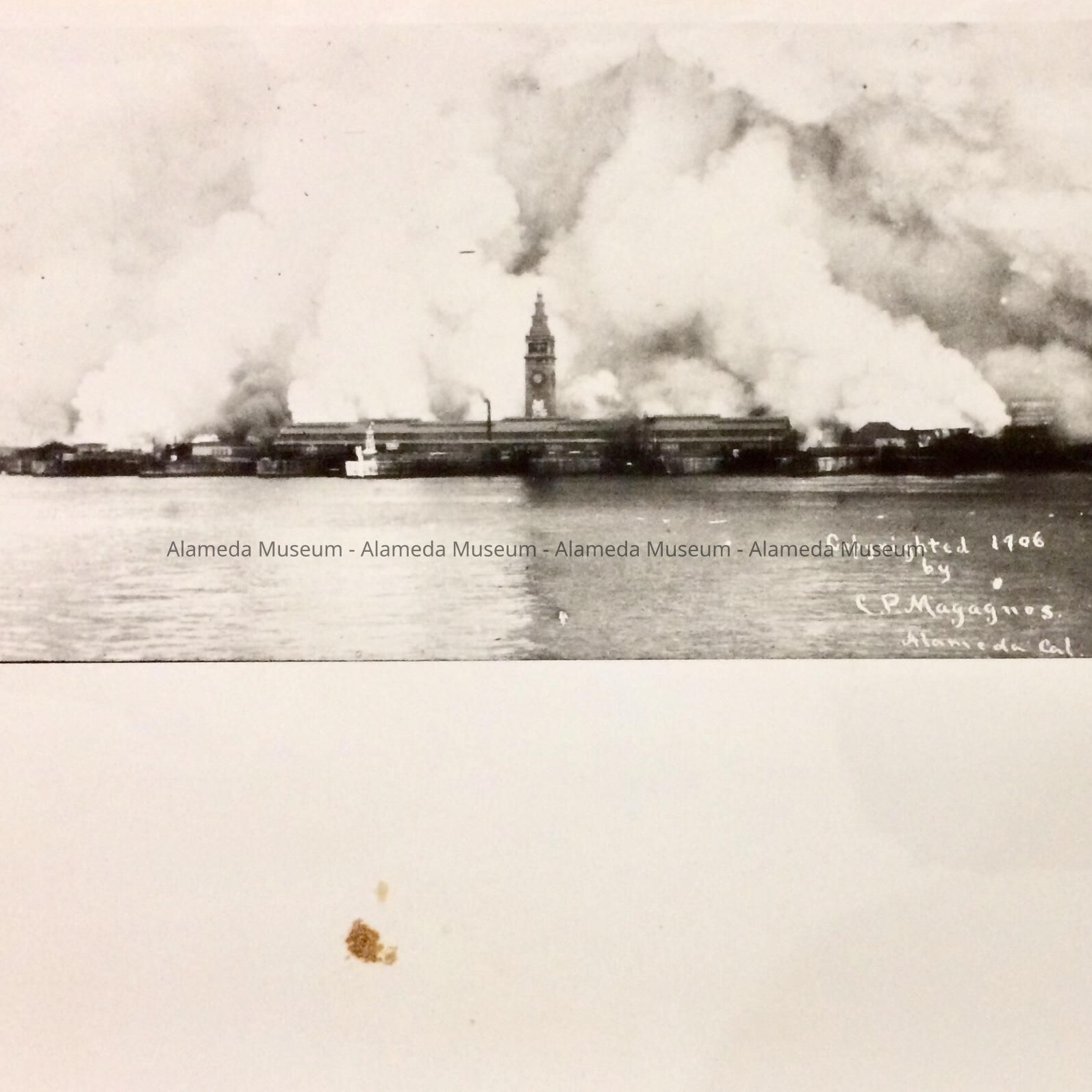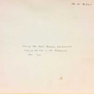 History of Object: View of the San Francisco fire (resulting from the earthquake) from the Bay, looking toward the Ferry Building, in back of which are smoke and flames.