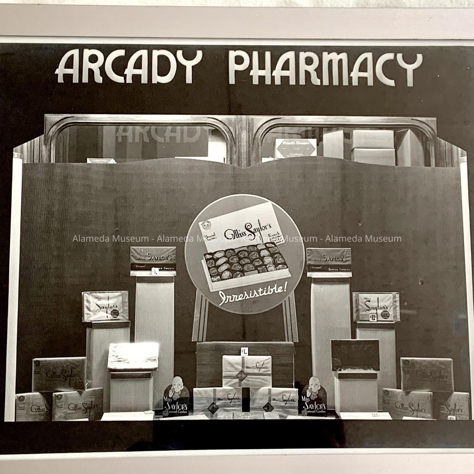History of Object: A photograph of the show window of a retail drug store, Arcady Pharmacy (location unknown), that features a display of various boxes of Miss Saylor's Chocolates.