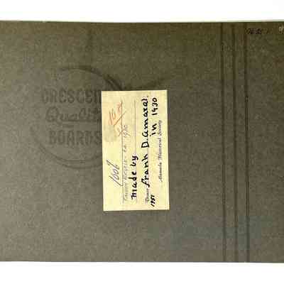 Description: Black/white glossy photo w/ lt. sepia toning, mounted on black paperboard. Photographer unknown. Old cataloging sticker is glued to the upper left edge of the mounting and a typed description label is affixed to the lower edge of same. Pin holes in all corners.