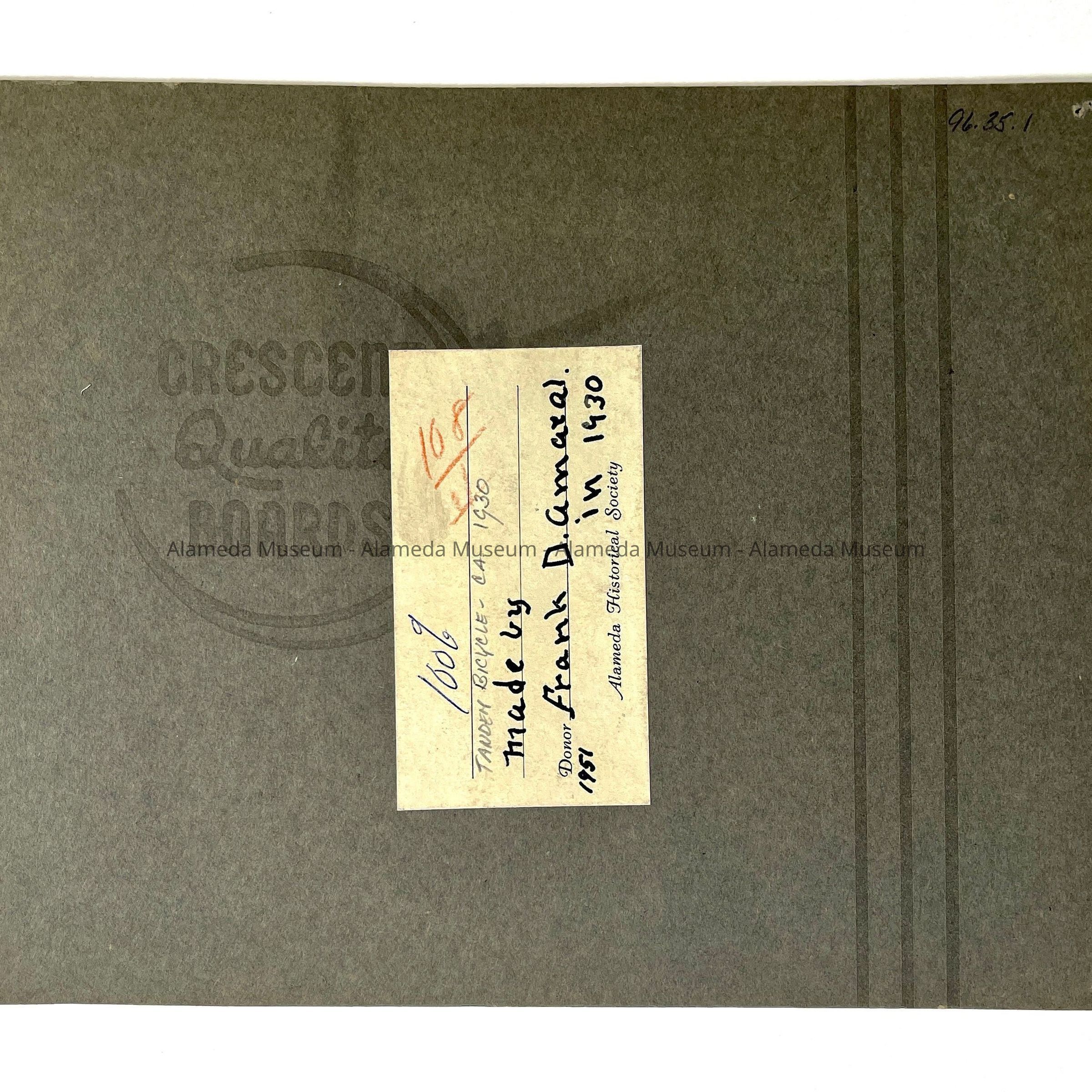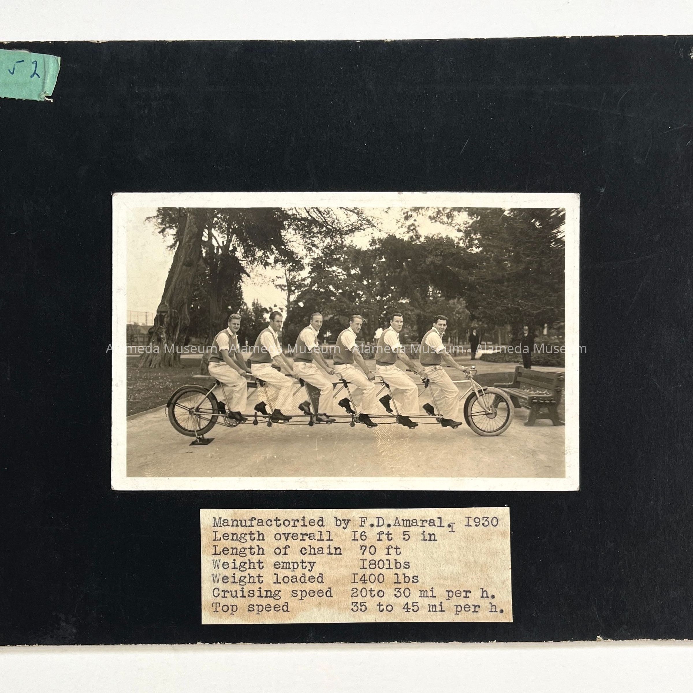 History of Object: View of six men seated on a long tandem bicycle, which was made by F.D. Amaral of Alameda, ca. 1930. This bicycle is on display at the Alameda Historical Museum.