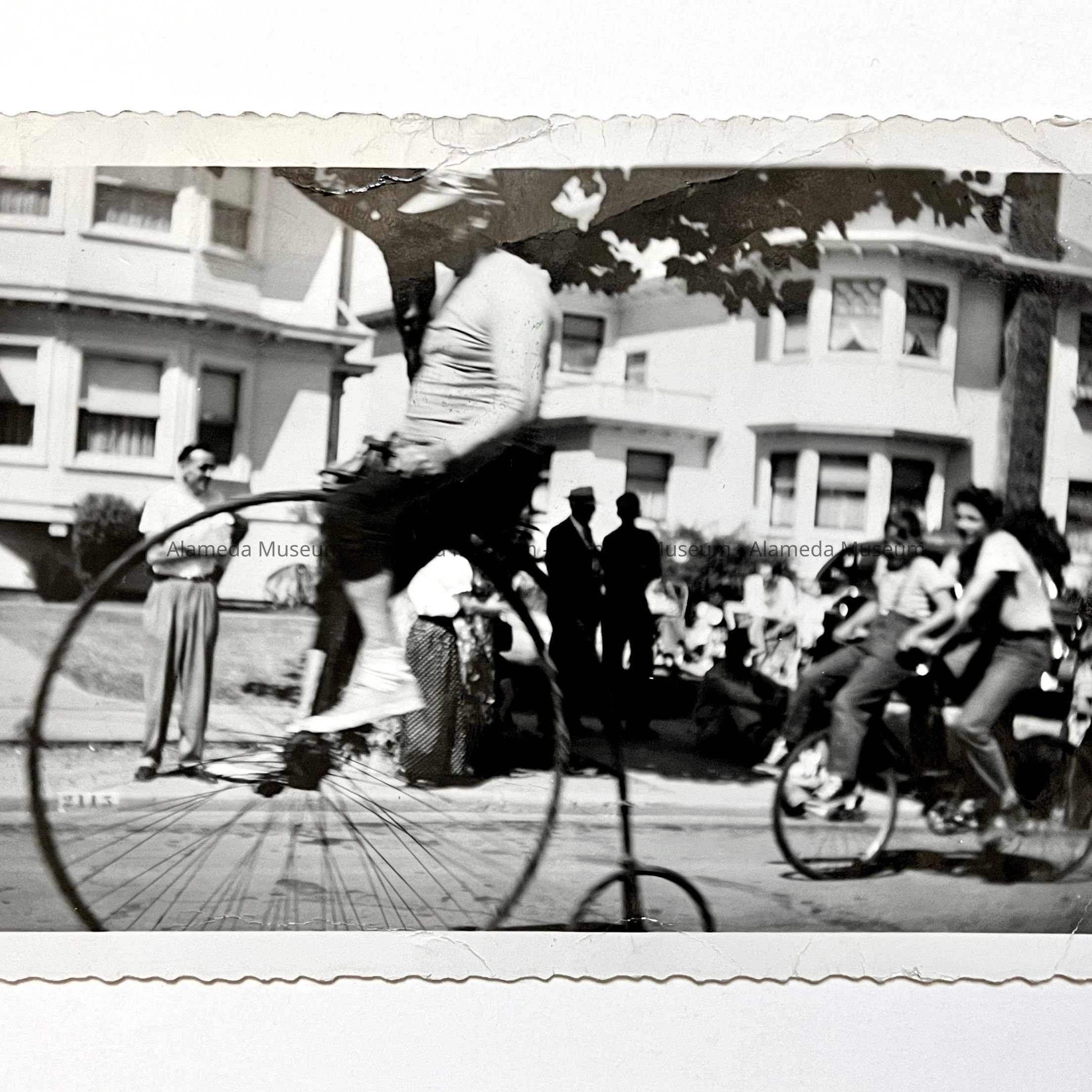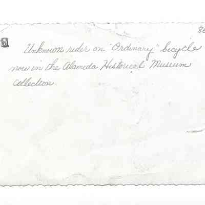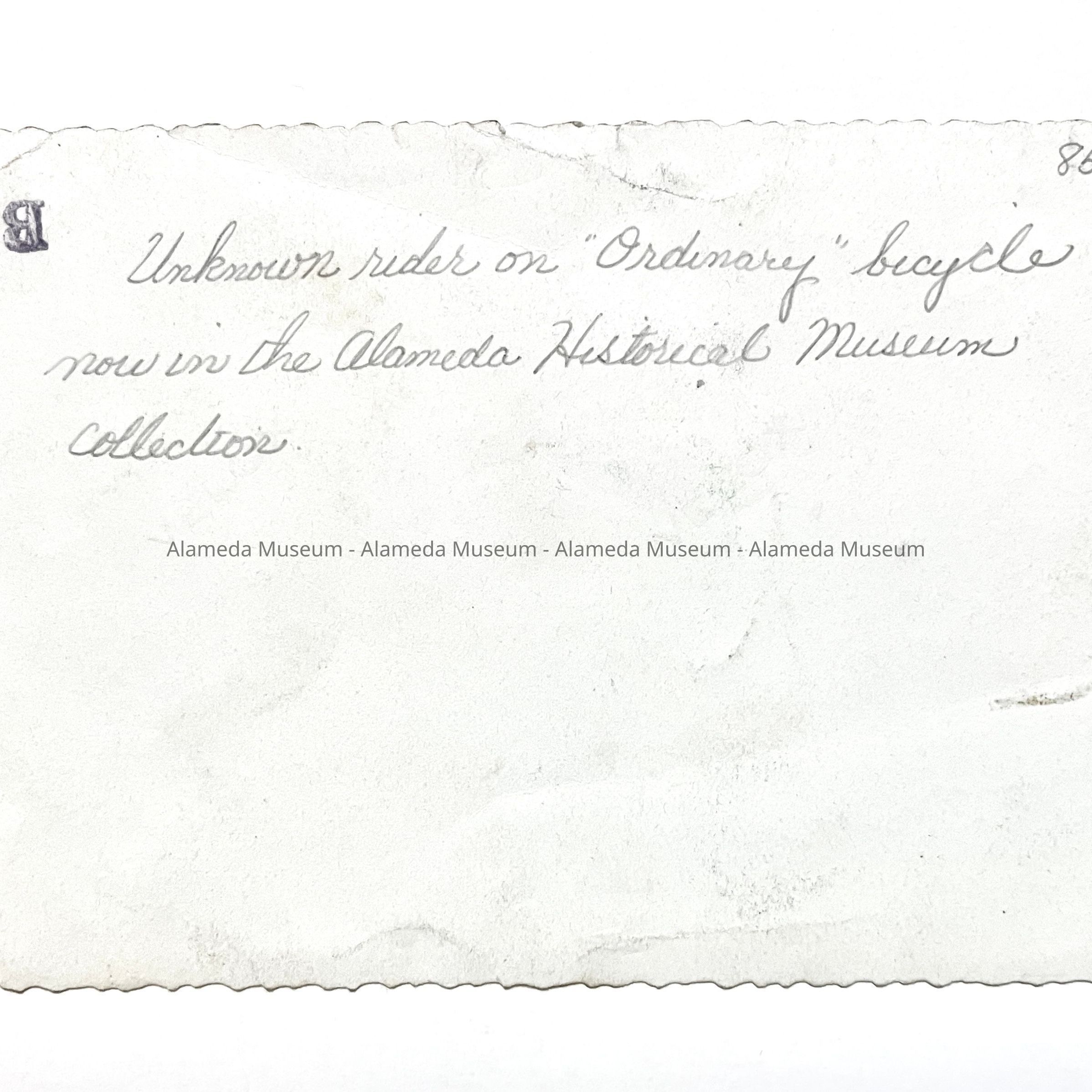 History of Object: Photo of a unknown rider on "Ordinary" bicycle now in the collection of the Alameda Historical Museum.