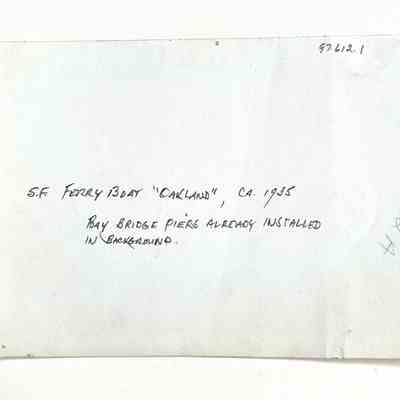 History of Object: Southern Pacific ferry "Oakland" crossing toward Alameda. Piers of the new Bay Bridge under construction are seen in the background.
