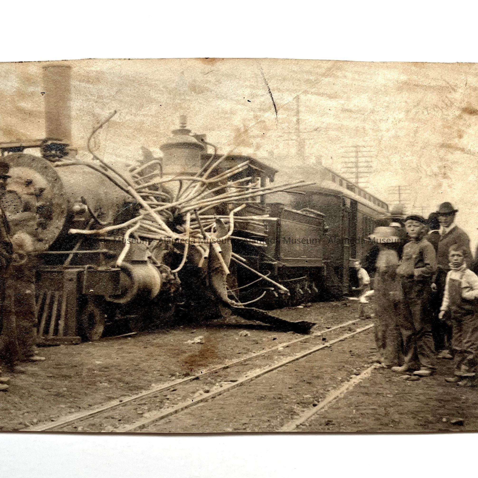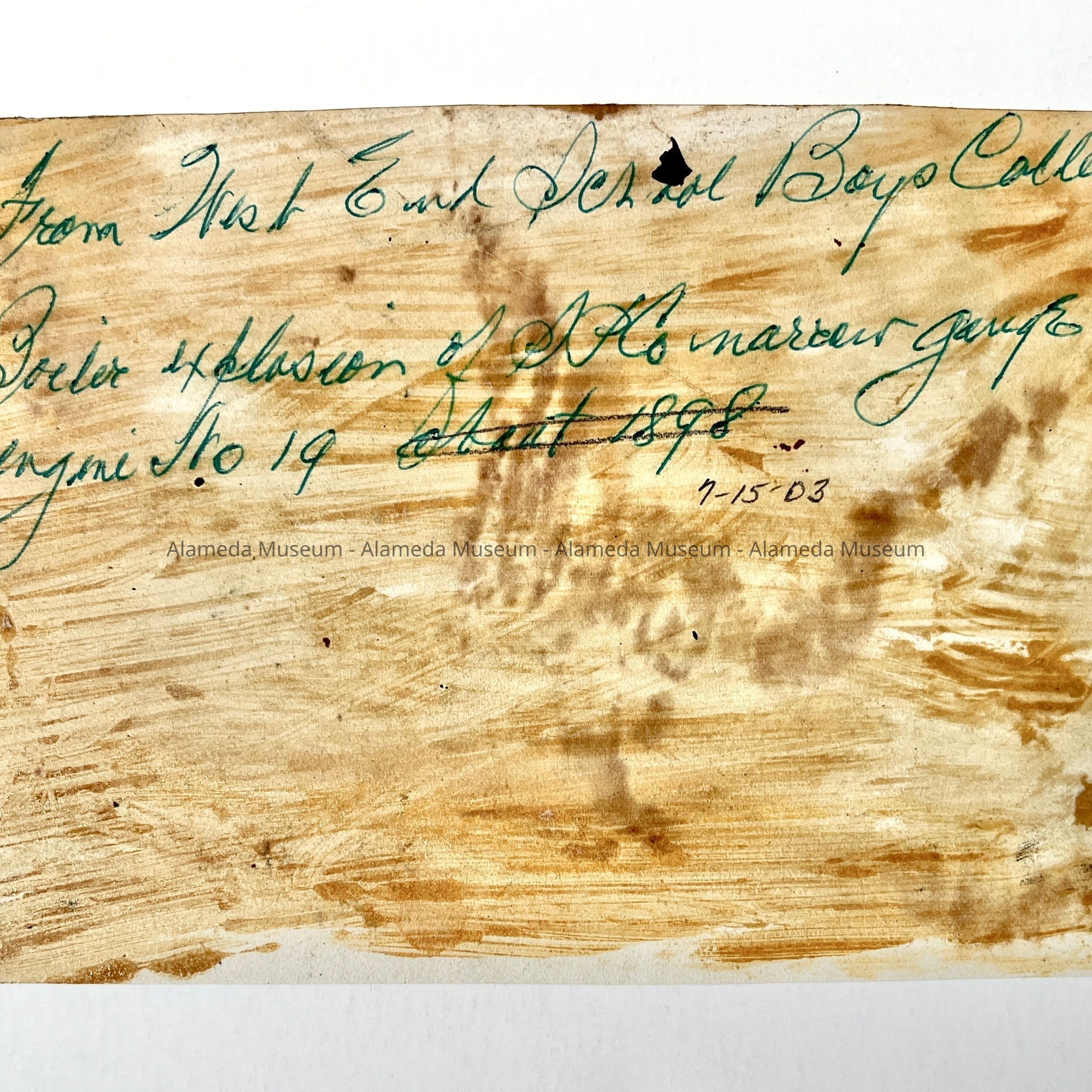 History of Object: View of old narrow-gauge Southern Pacific locomotive #19 which blew up in Alameda on July 15, 1903. No one was killed. The engineer was a Mr. Duncan; the fireman a Mr. Gale. This photo was originally part of the "West End School Boys Collection", per notation on verso.