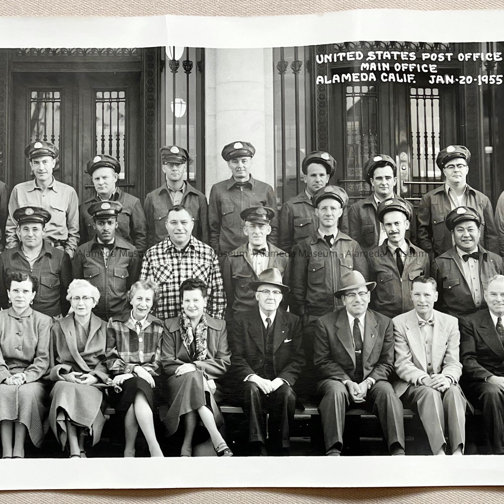 PHOTOGRAPH OF THE EMPLOYEES, MAIL CARRIERS, AND POSTMASTER, FORD E SAMUEL, OF THE ALAMEDA BRANCH, UNITED STATES POST OFFICE, POSED IN FRONT OF THE MAIN OFFICE, CENTRAL AND PARK AVENUES, DATED JANUARY 20, 1955. THE DONOR'S BROTHER, PAUL STREBEL, IS A MEMBER OF THE GROUP. THE FOLLOWING COLLECTION IS FROM THE STREBEL FAMILY. JOHN STREBEL (ORIGINALLY FROM GERMANY) AND HIS WIFE (NATIVE OF AUSTRIA) PURCHASED THEIR LATE HOME AT 1117 UNION STREET, ALAMEDA, IN 1923. IT HAS BEEN SUBSEQUENTLY OWNED BY THEIR TWO SONS, FRANK AND PAUL.