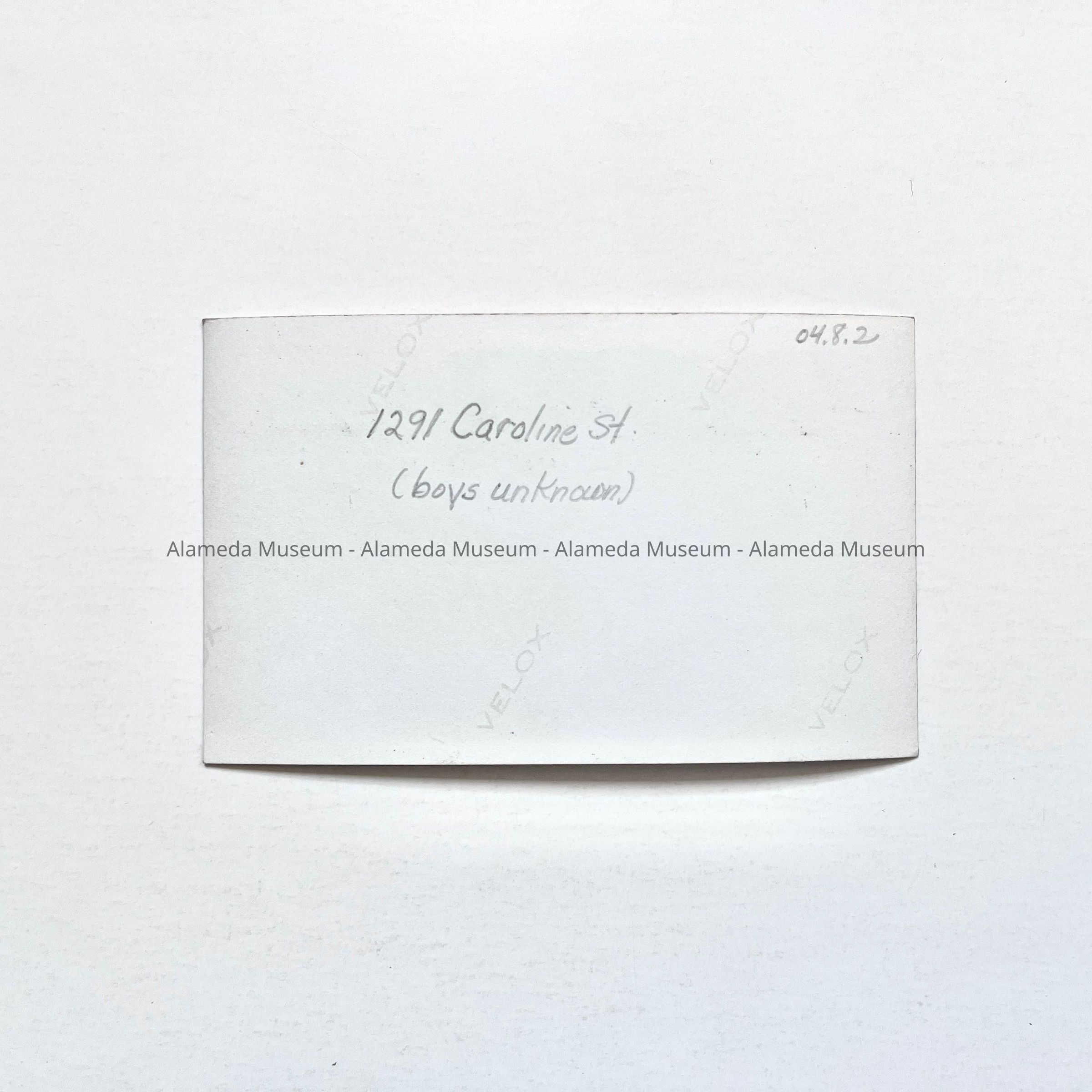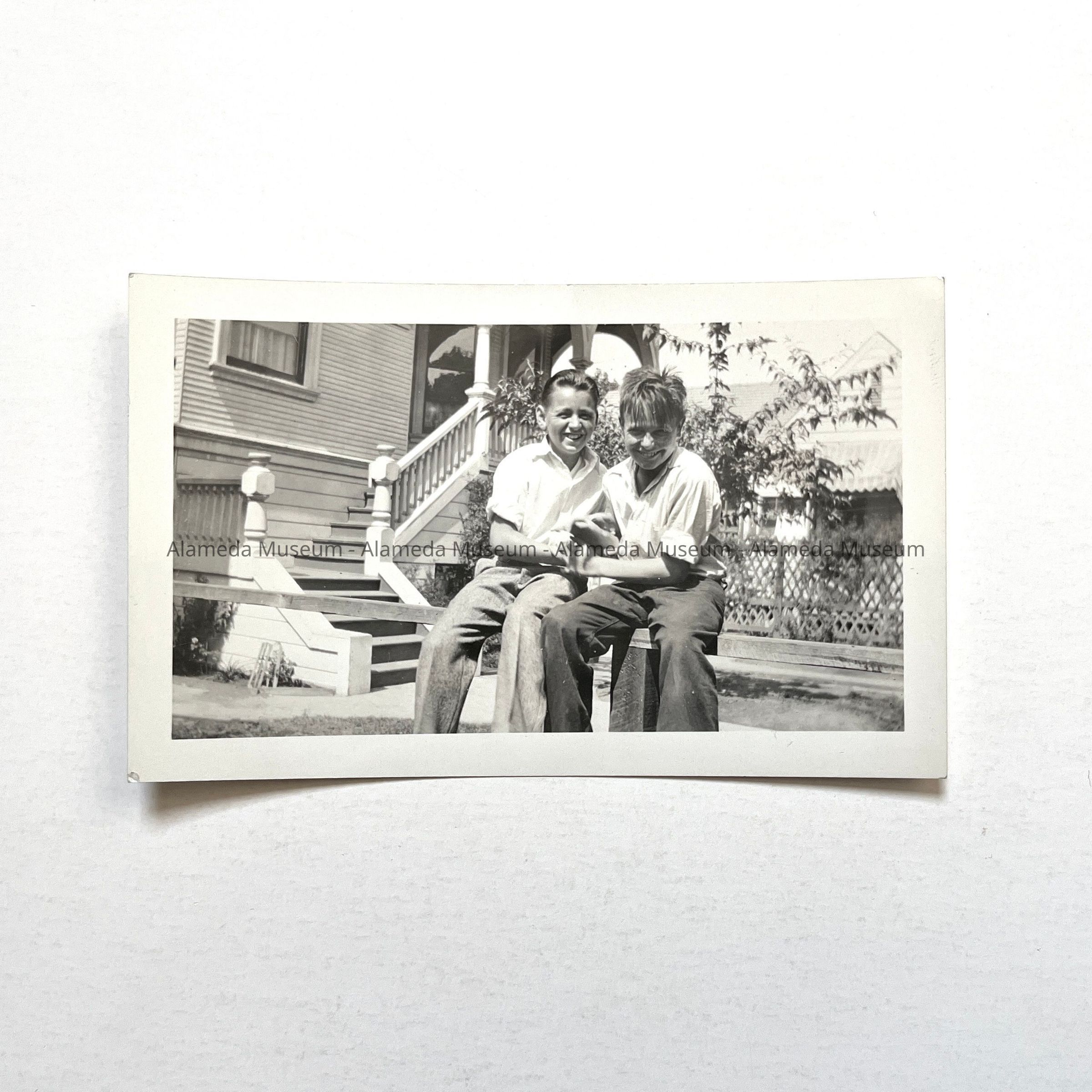 HISTORY OF OBJECT: PHOTOGRAPH DEPICTING JACK LAWRENCE AND WILLIS PARKER IN FRONT OF THE STAIRCASE AND BALUSTRADE OF 1291 CAROLINE STREET, ALAMEDA, ERECTED IN 1896.