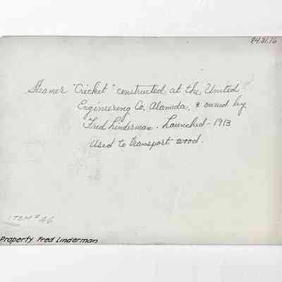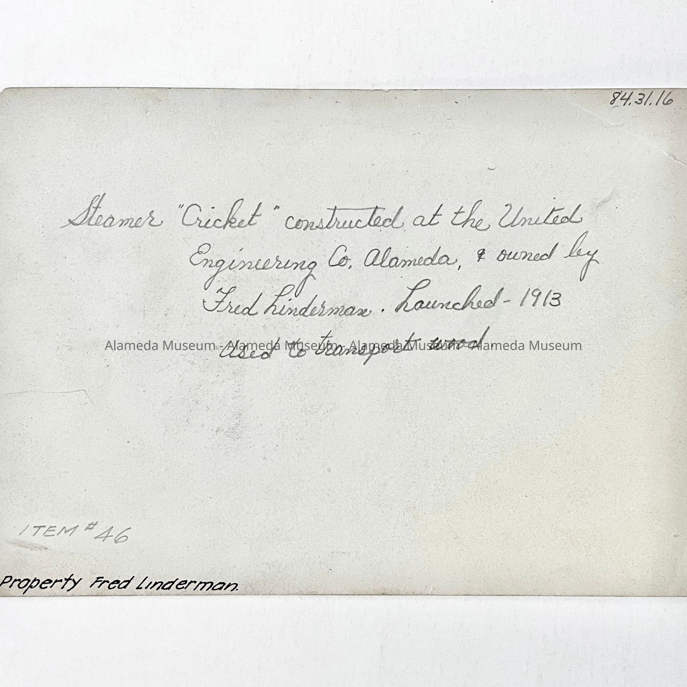 History of Object: Photo of the steamer "Cricket", constructed at the United Engineering Co., Alameda, and owned by