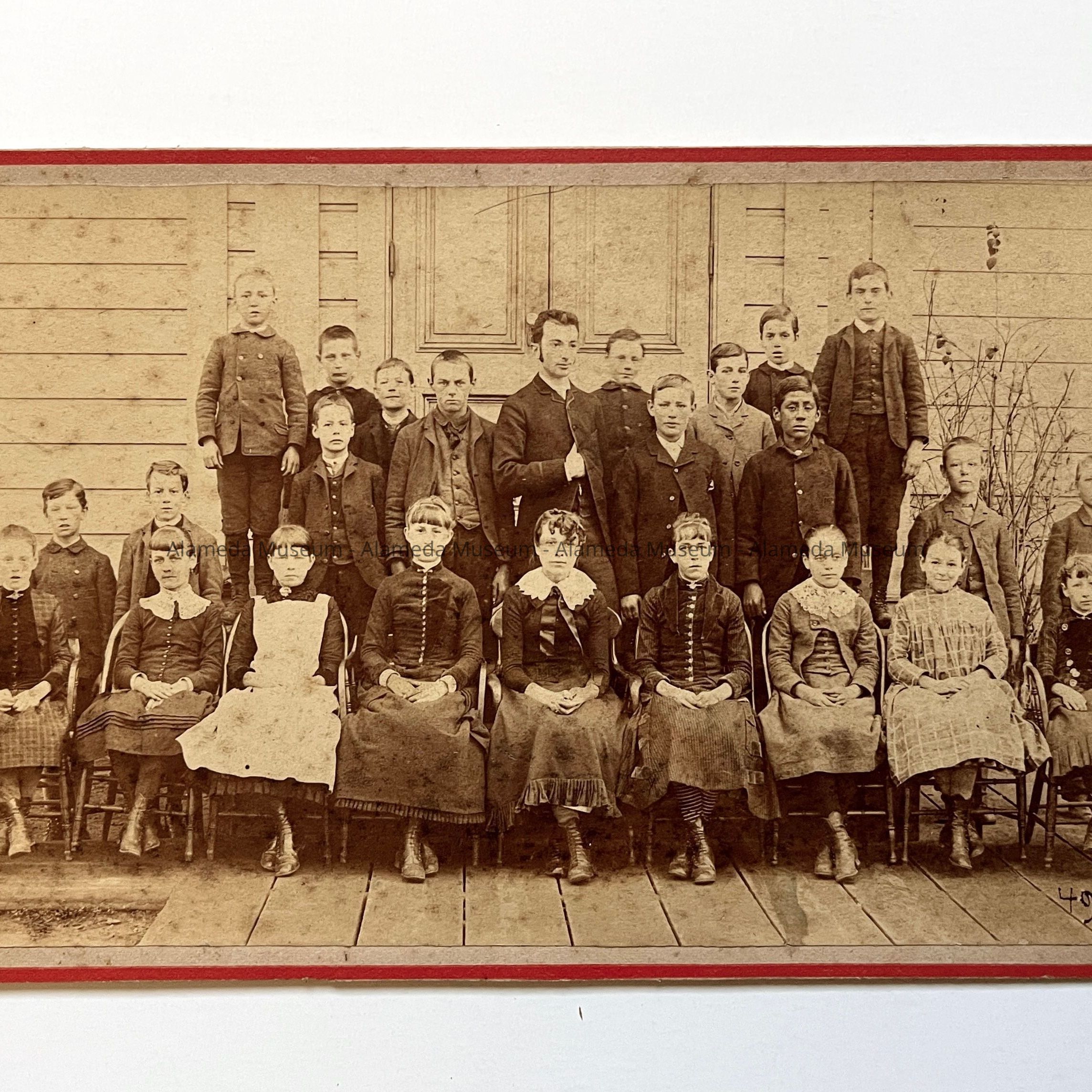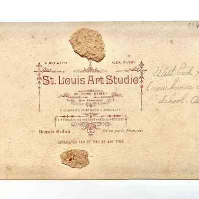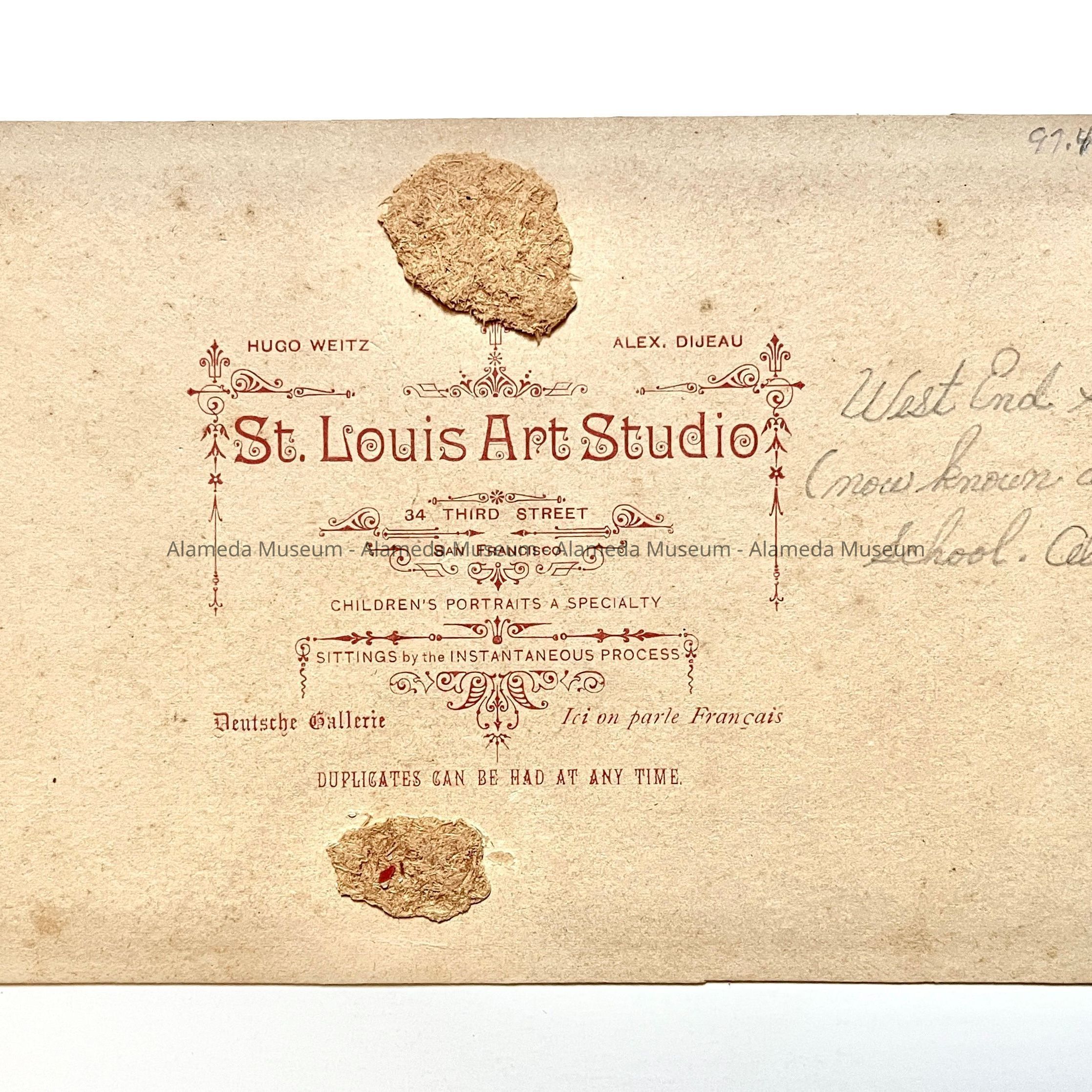 Description: Sepia-toned albumen print photo mounted on tan paperboard, upon which is imprinted a red border to highlight the image. Photographer: St. Louis Art Studio, S.F. (per red imprinting on verso). The mounting has spotting, foxing, and cropped top and bottom edges. The image has spotting and foxing.