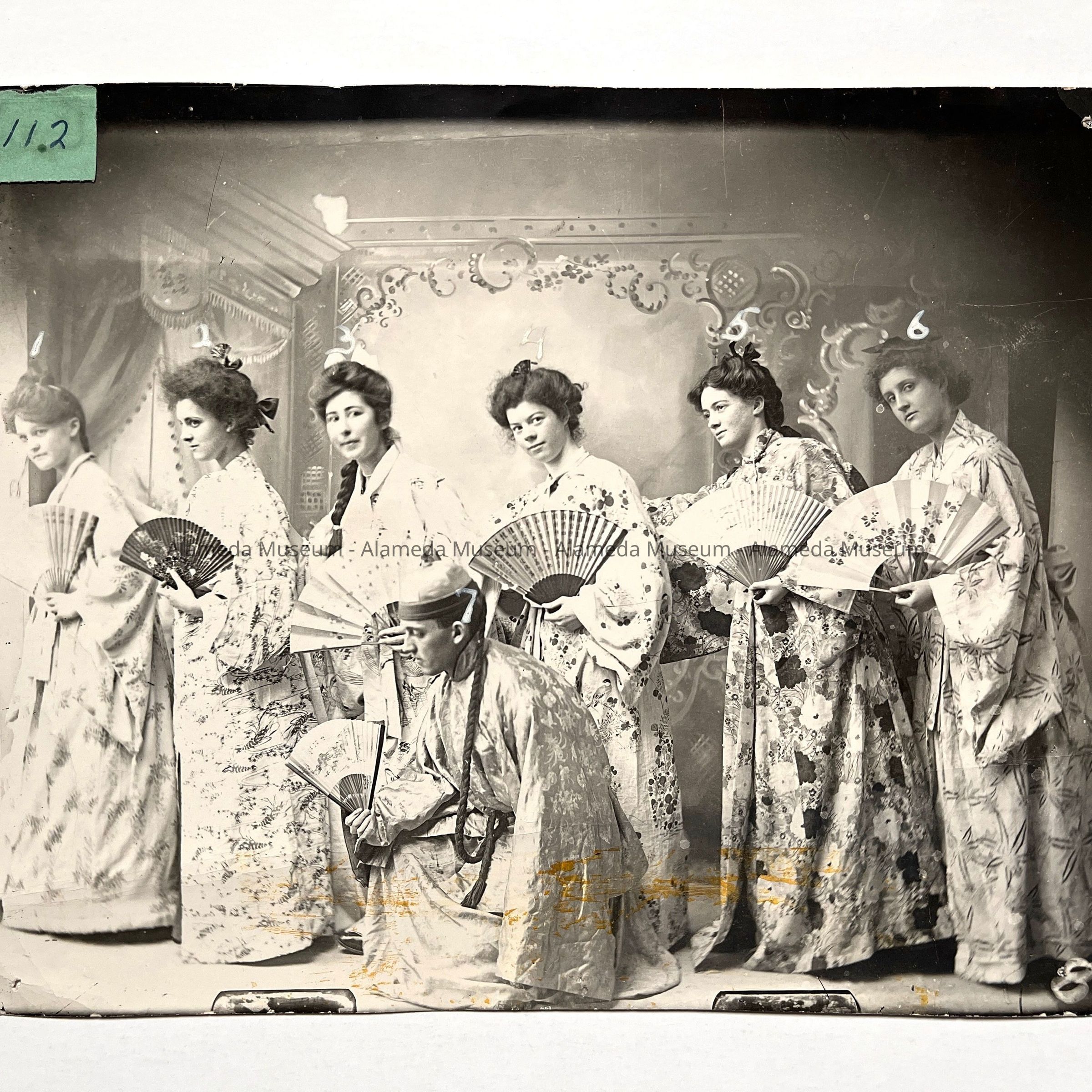 History of Object: Charming picture of seven students (6 female and 1 male) clad in Japanese garments, all holding open fans. Names of the performers in this play are written on the verso.
