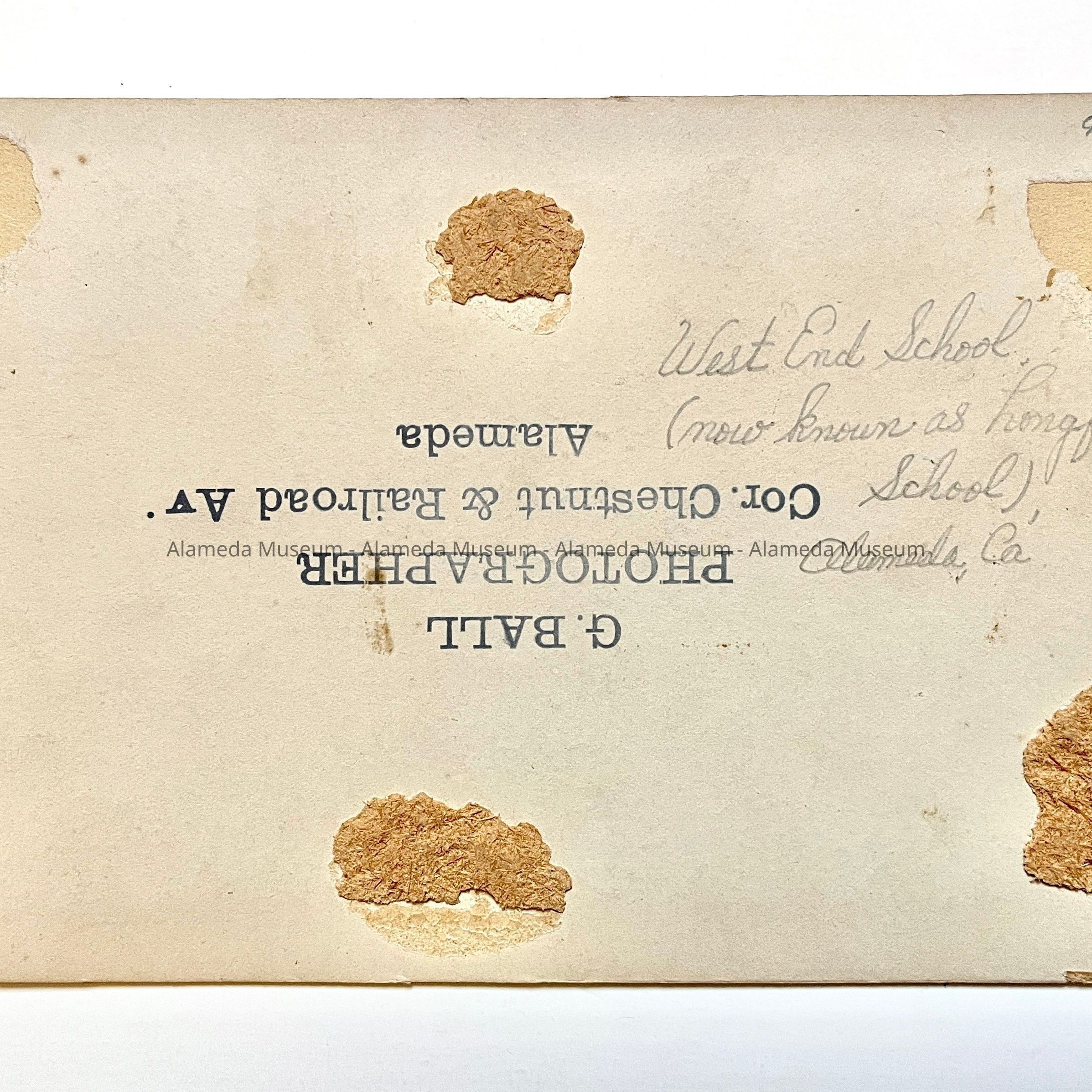 Description: Sepia-toned albumen print photo mounted on tan paperboard. Photographer: G. Ball, Alameda (per rubber stamping in blue ink on verso). The mounting has been cropped along the top and bottom margins.