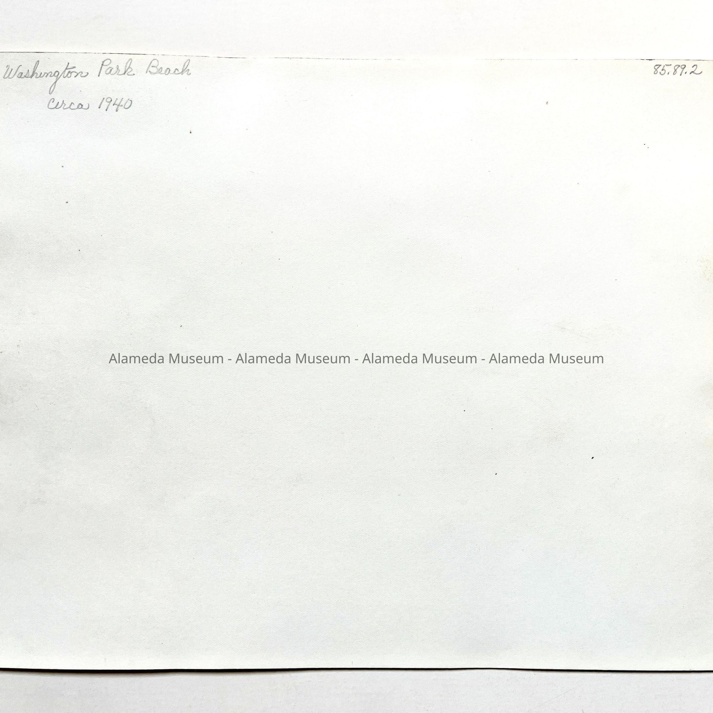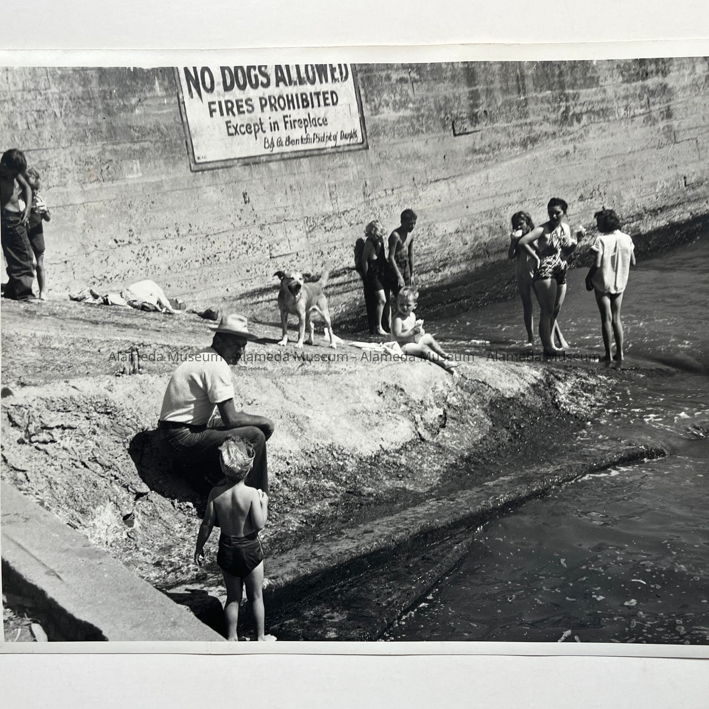 History of Object: Photo of sunbathers near the concrete retaining wall, Washington Park beach, Alameda, circa 1940.
