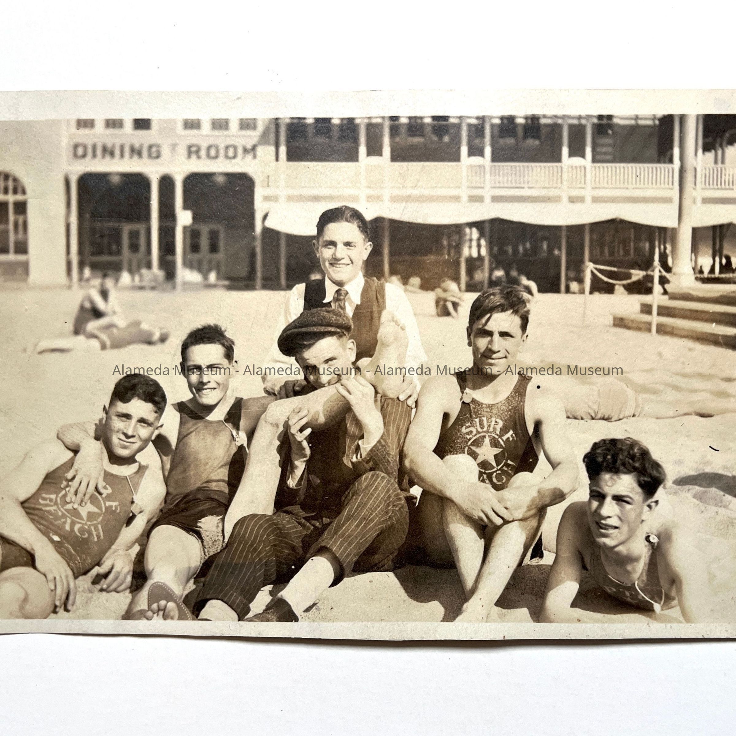 Photo of teenage boys at Neptune Beach, some wearing Surf Beach suits, c. 1920sEntry/Object ID