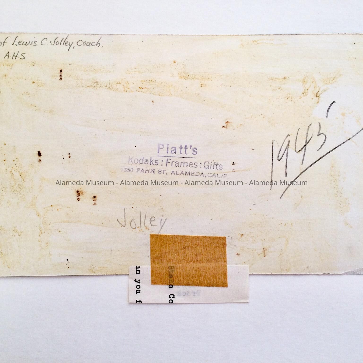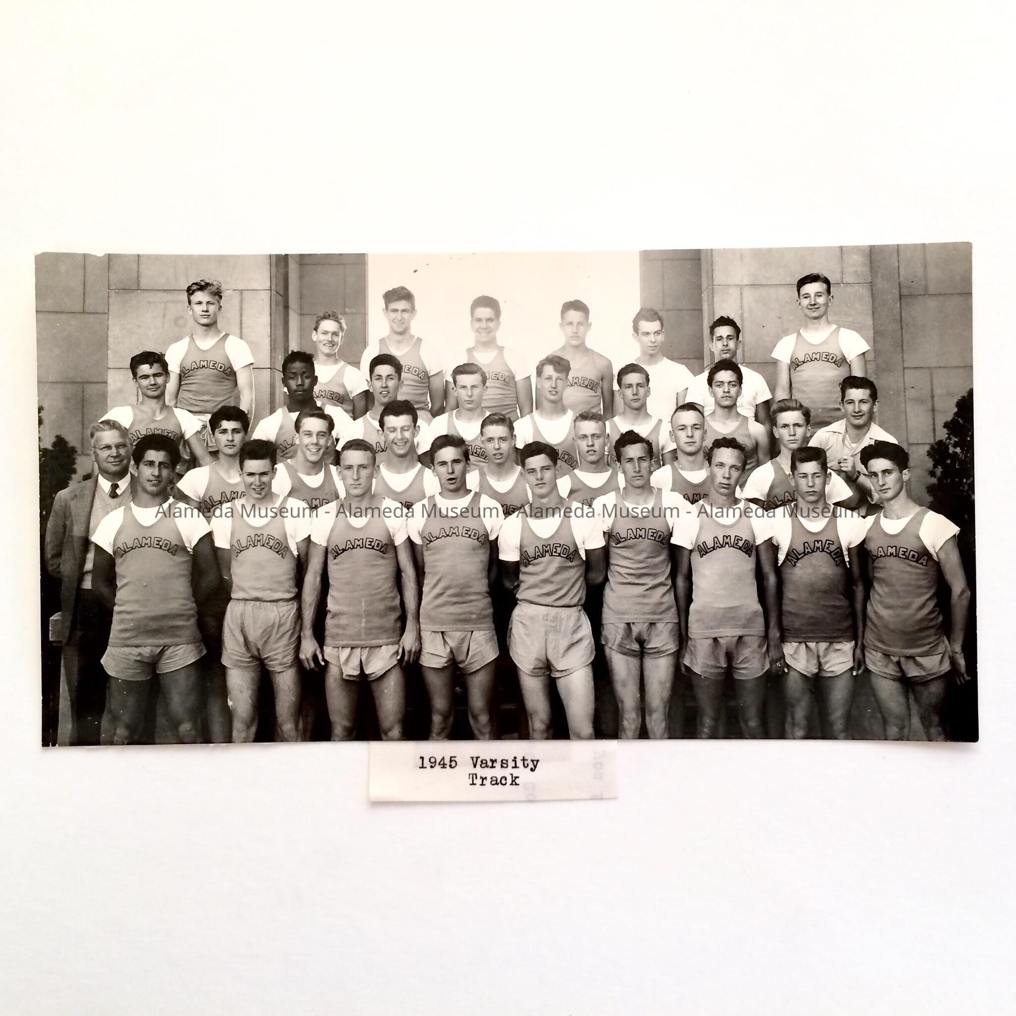 PHOTO OF MEMBERS OF THE 1945 VARSITY TRACK TEAM, ALAMEDA HIGH SCHOOL, WITH COACH LEWIS C JOLLEY.
