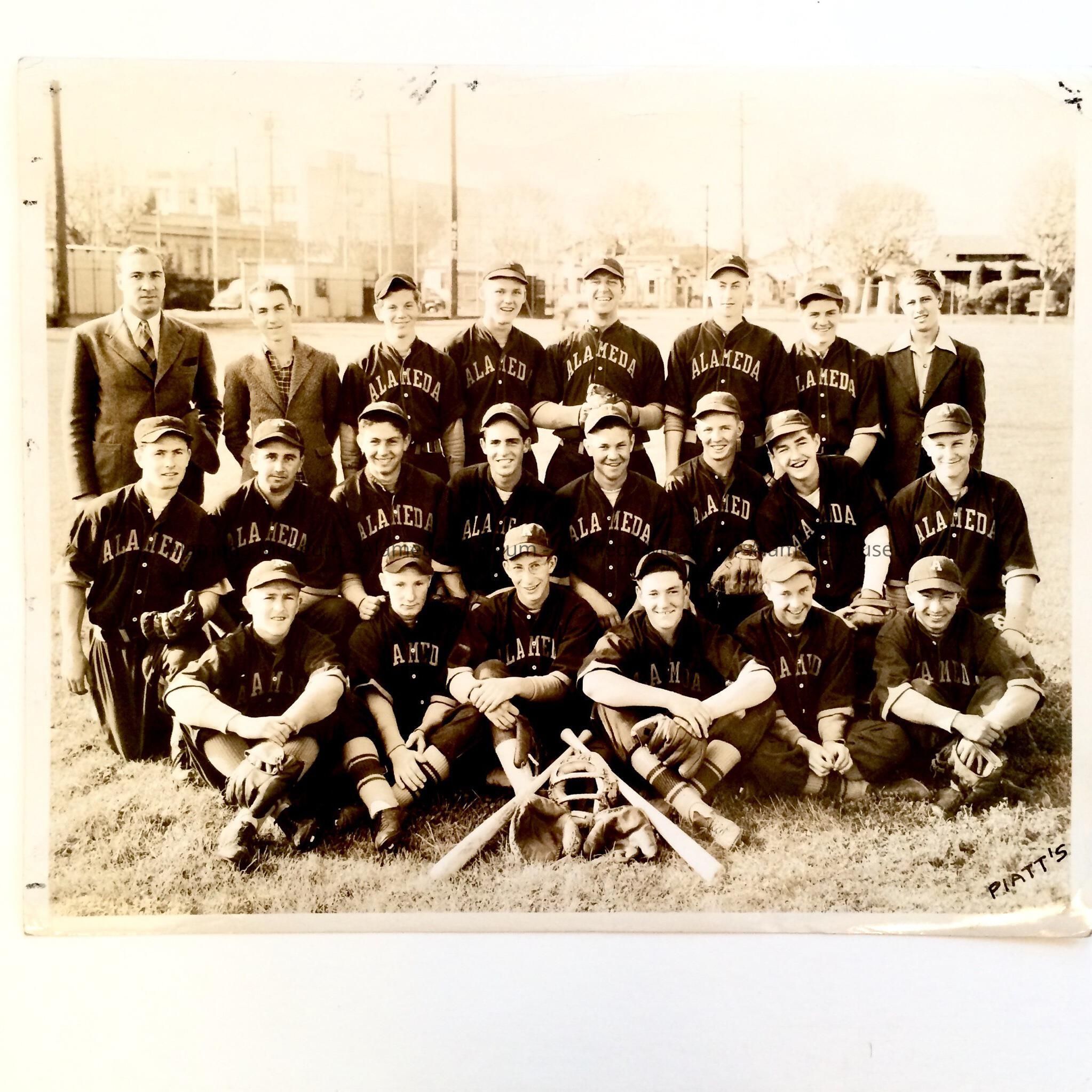 A PHOTO OF THE VARSITY BASEBALL TEAM OF ALAMEDA HIGH SCHOOL, PICTURED IN THEIR OFFICIAL UNIFORMS.