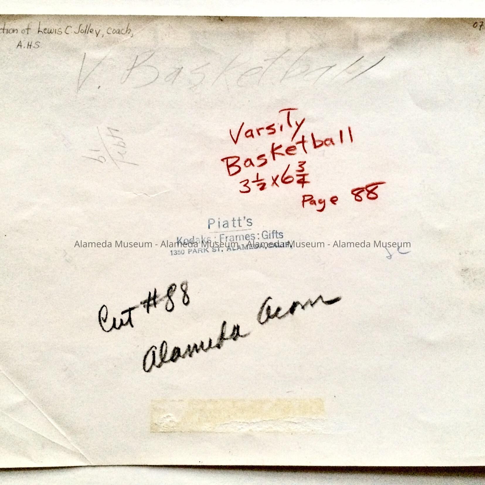 Photo of the Alameda High School Varsity Basketball team, c. 1930sEntry/Object ID