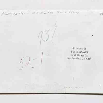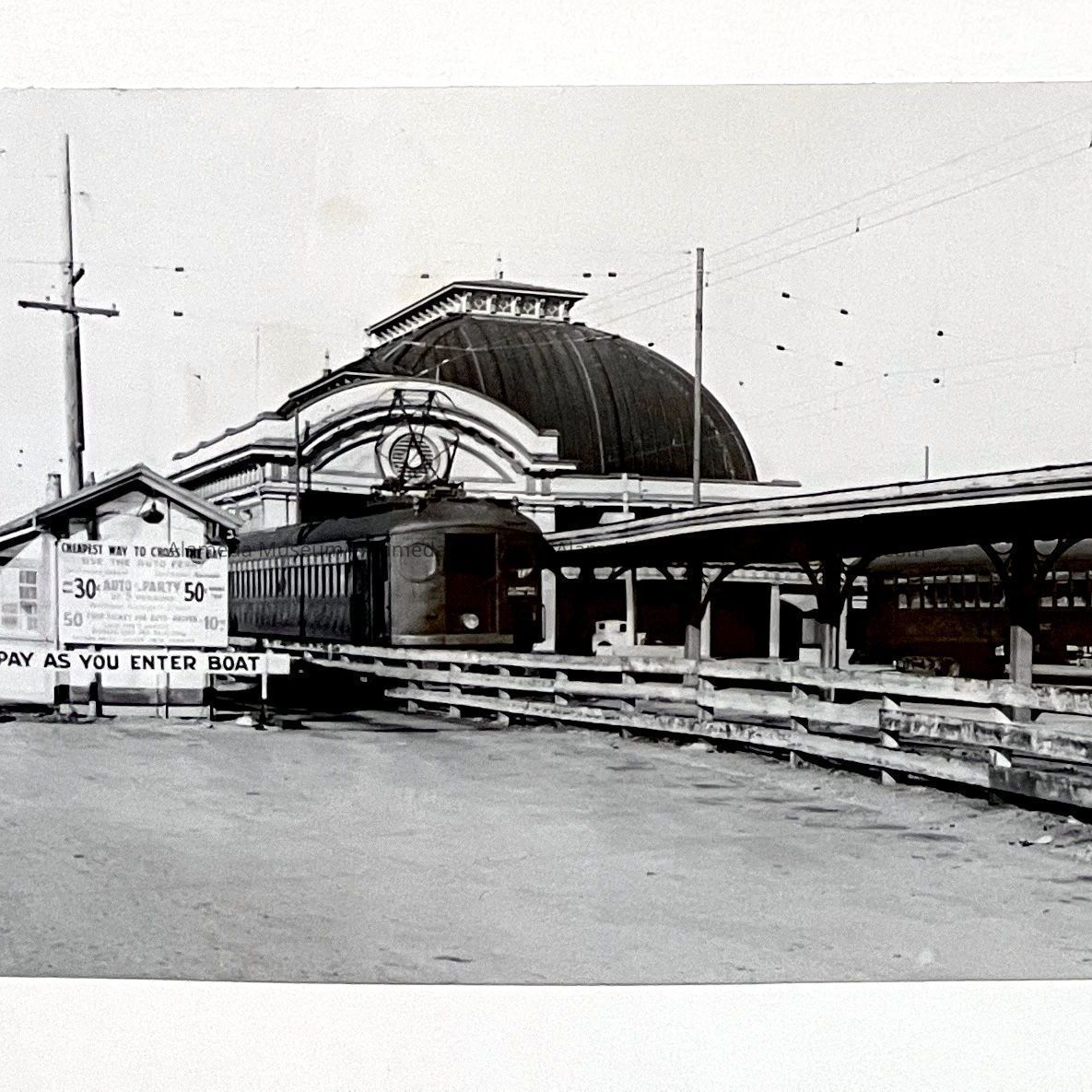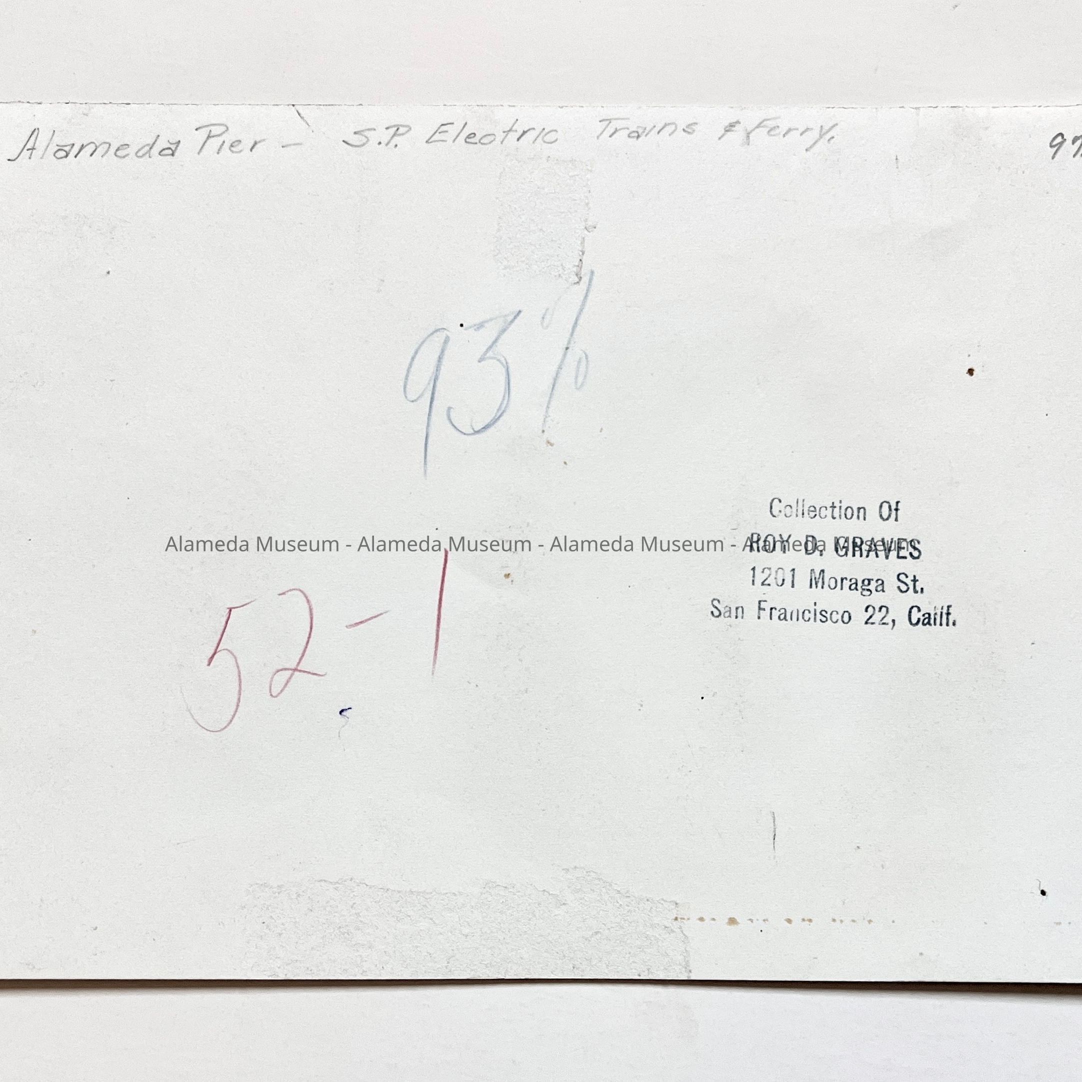 History of Object: A view of the Alameda mole showing the passenger entrance with the Southern Pacific trains waiting nearby.